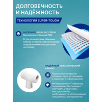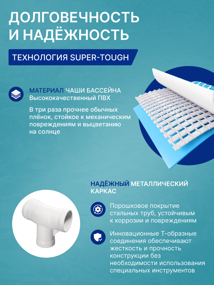 - Высококачественный материал: Трехслойное ПВХ покрытие Super-Tough в три раза прочнее обычных пленок, стойкое к механическим повреждениям и выцветанию на солнце. - Полипропиленовая лента обеспечивает дополнительную поддержку формы бассейна.