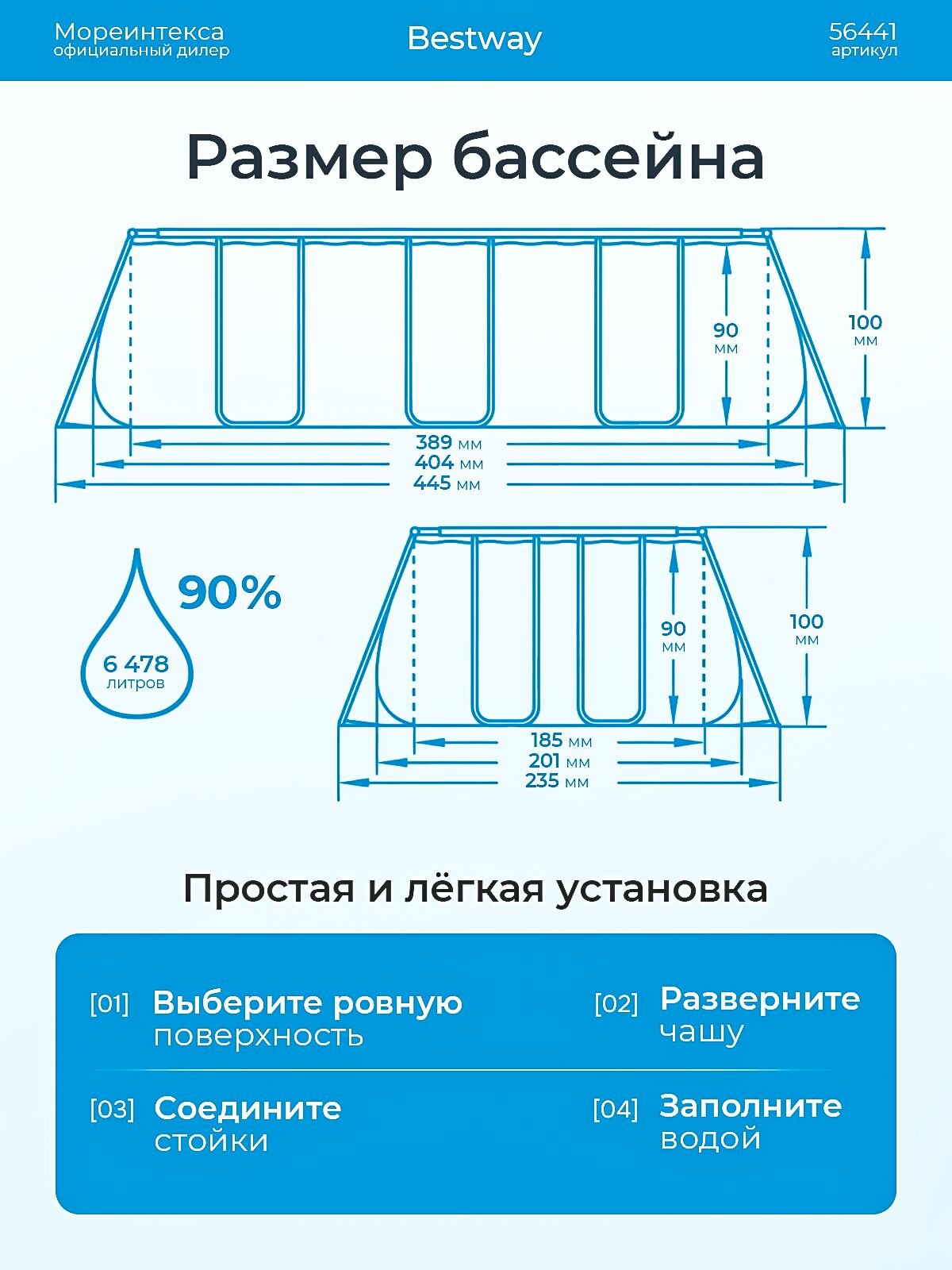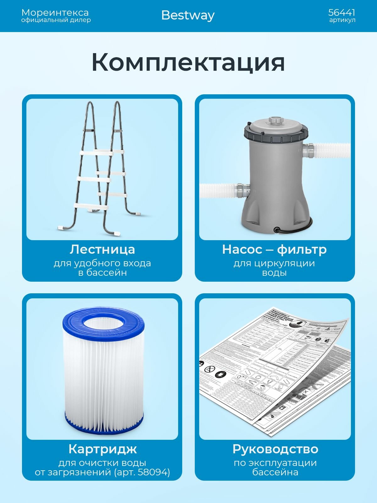 В комплекте к бассейну входят: фильтр-насос с картриджем, лестница, диспенсер.