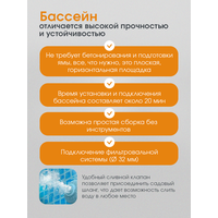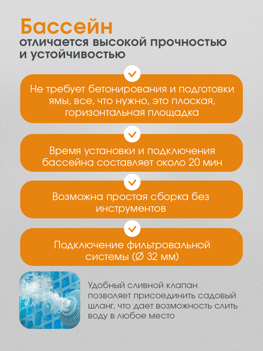 Сборка и установка бассейна не требуют много времени и усилий. Все, что вам нужно - это плоская, горизонтальная площадка. Бассейн может быть легко разобран и собран заново, что делает его сезонным решением.