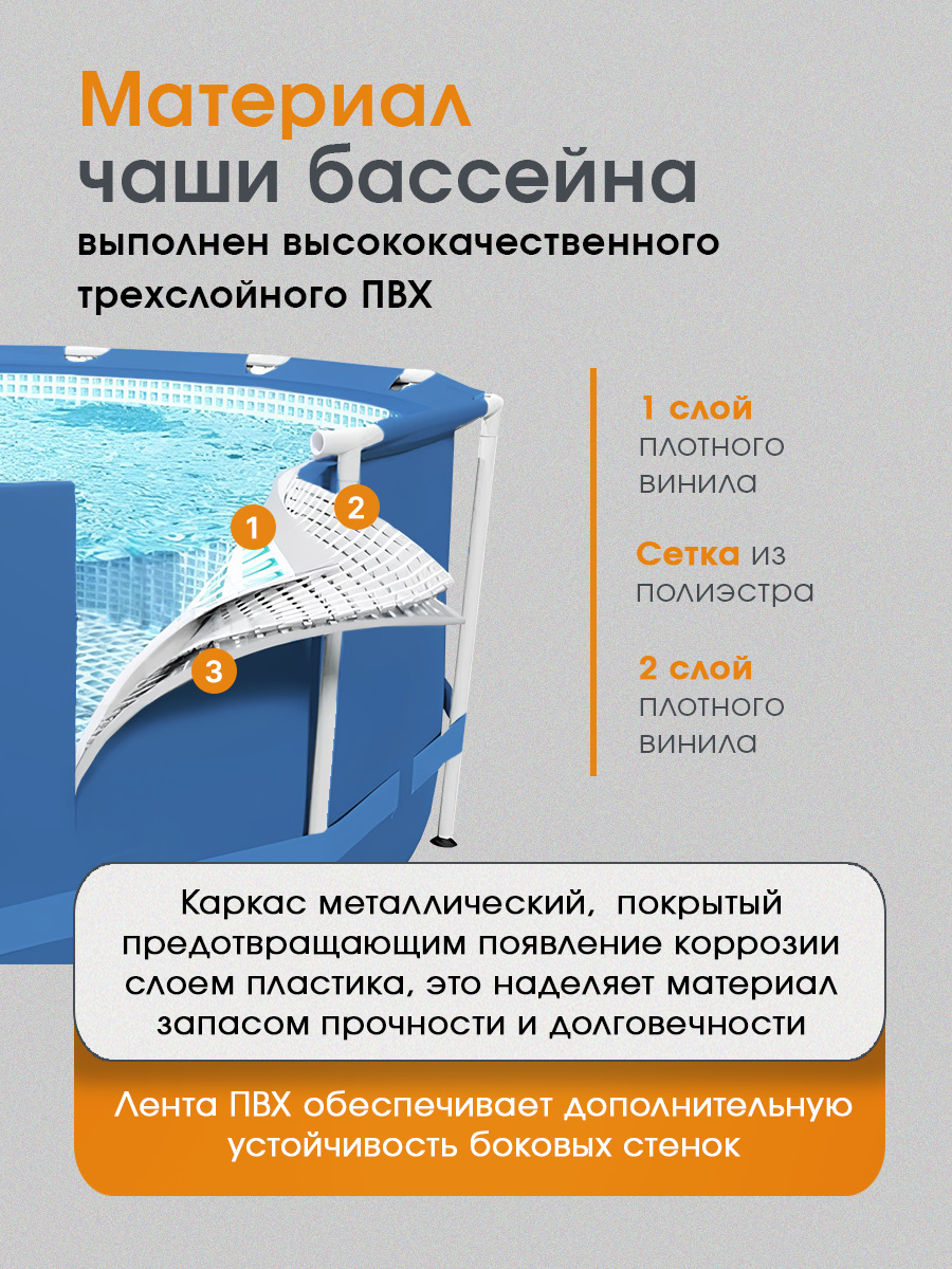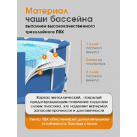 Бассейн выполнен в лаконичном синем цвете, который гармонично впишется в любой ландшафтный дизайн. Каркас бассейна изготовлен из прочного металла, покрытого слоем пластика для предотвращения коррозии. Чаша бассейна выполнена из трехслойного ПВХ, состоящего из двух слоев плотного винила и сетки из полиэстера между ними. Это обеспечивает высокую прочность и устойчивость конструкции.