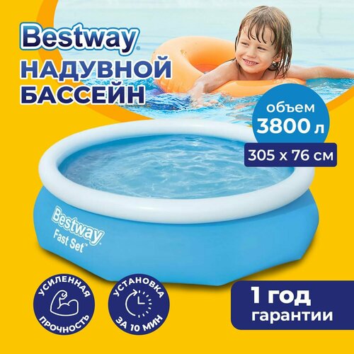 Бассейн надувной водный Bestway Fast Set - яркое дополнение ландшафтного дизайна, идеальный вариант для семейного отдыха в жаркие летние дни. Бассейн для взрослых и детей бествей предназначен для водных затей, для купания, плавания. Установите комплекс на дачном участке и ребенок будет проводить в нем все своем время с радостью. Бассейн надувной круглый имеет жесткое дно из ПВХ-пленки, устойчивый, надежный и безопасный. Он универсален и подойдет как для взрослых, так и для малышей. Обязательно покажите ребенку, как можно играть, придумывайте вместе игры, пригласите друзей для веселого времяпровождения на свежем воздухе. Игровой бассейн позволит постепенно приучать к плаванию малышей, главное, чтобы они находились под присмотром. Надувной бассейн поможет подарить незабываемые впечатления не только для детей, малышей, но и для бабушки, взрослых, которые будут наблюдать за эмоциями ребенка, а также открыть дачный сезон. Самый простой уход за бассейном и его очистка. Легко надувается и также легко сдувается, не требует серьезного мытья, достаточно протереть влажным полотенцем или промыть проточной водой. Хороший подарок для семьи, девочек, мальчиков. Надувные бассейны очень удобно устанавливать на любом свободном участке возле частного дома или дачи. Эта серия отличается простой установкой, которая заключается в надувании и наполнении водой. Всего 10-15 минут - и спасение от жаркого солнца у Вас во дворе. Он особенно необходим людям, у которых есть маленькие дети, потому что они смогут все лето наслаждаться прохладой воды. Материал, используемый при изготовлении бассейнов этой серии, состоит из прочного материала, что обеспечивает высокую надежность и износостойкость. Бассейн для дачи имеет уникальную форму и яркий дизайн, который понравится детям и взрослым. Габариты глубокого бассейна позволяют находиться в воде одновременно нескольким членам семьи, в среднем до 5 человек. Объем семейного надувного бассейна составляет 3638 литров воды. Также можно использовать дополнительные товары для бассейна для времяпрепровождения, такие как - круг для бассейна, надувные шарики. Вода спускается с помощью сливного клапана. На холодное время года не рекомендуем оставлять бассейн на открытом воздухе. Удобный сливной клапан позволяет присоединить садовый шланг, что дает возможность слить воду в любое место. Насос в комплект не в ходит и приобретается отдельно. В комплекте идет самоклеящаяся заплатка. Также вы можете посмотреть другие товары бренда бествей, такие как бассейн каркасный прямоугольный, надувной бассейн детский, глубокий бассейн с горкой большой, бассейн детский с навесом для малышей и надувной игровой центр с горкой, а также бассейн, имеющий мягкое надувное дно