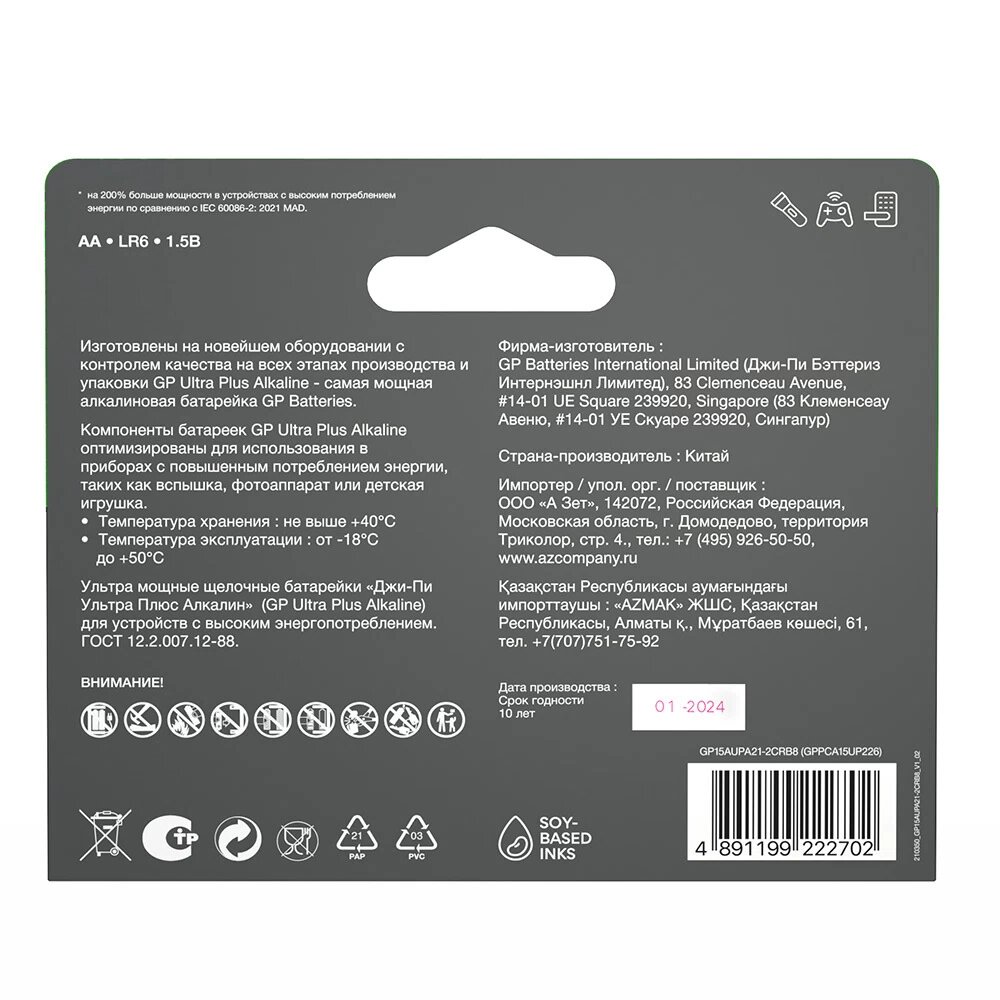 Купить Батарейка GP Batteries Ultra+ Алкалин AA пальчиковая LR6 1,5 В (8 шт.) (GP 15AUPA21-2CRB8) с доставкой по всей России.