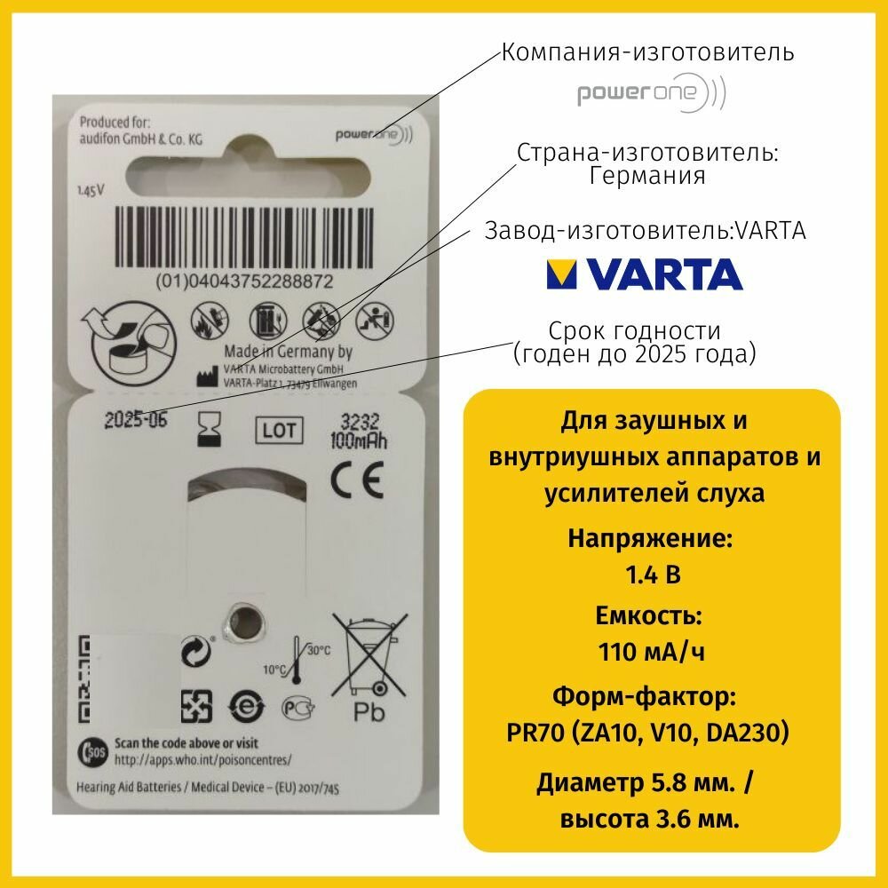 Батарейки для слуховых аппаратов Audifon (Германия) Тип 10 совместимы со слуховыми аппаратами брендов: Audifon, Aurica, Bernafon, Blamey Saunders, Costco, Hanstaton, Microtech, Oticon, Phonak, ReSound, Rexton, Siemens Signia, Sonic, Starkey, Unit, Ритм, и другими. Батарейки являются воздушно-цинковыми, отличаются большей энергоэффективностью, не окисляются, не вздуваются и не протекают, при своевременной замене, в то время как аналоги, изготовленные из прочих материалов быстро приходят в негодность, протекают в слуховой аппарат и вздутием ломают корпус. Так же применение не соответствующих элементов питания может вывести из строя слуховой аппарат, за счет не верной подачи тока.