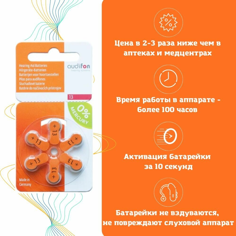 Батарейки для слуховых аппаратов Audifon (Германия) Тип 13 совместимы со слуховыми аппаратами брендов: Audifon, Aurica, Bernafon, Blamey Saunders, Costco, Hanstaton, Microtech, Oticon, Phonak, ReSound, Rexton, Siemens Signia, Sonic, Starkey, Unit, Ритм, и другими. Батарейки являются воздушно-цинковыми, отличаются большей энергоэффективностью, не окисляются, не вздуваются и не протекают, при своевременной замене, в то время как аналоги, изготовленные из прочих материалов быстро приходят в негодность, протекают в слуховой аппарат и вздутием ломают корпус. Так же применение не соответствующих элементов питания может вывести из строя слуховой аппарат, за счет не верной подачи тока.