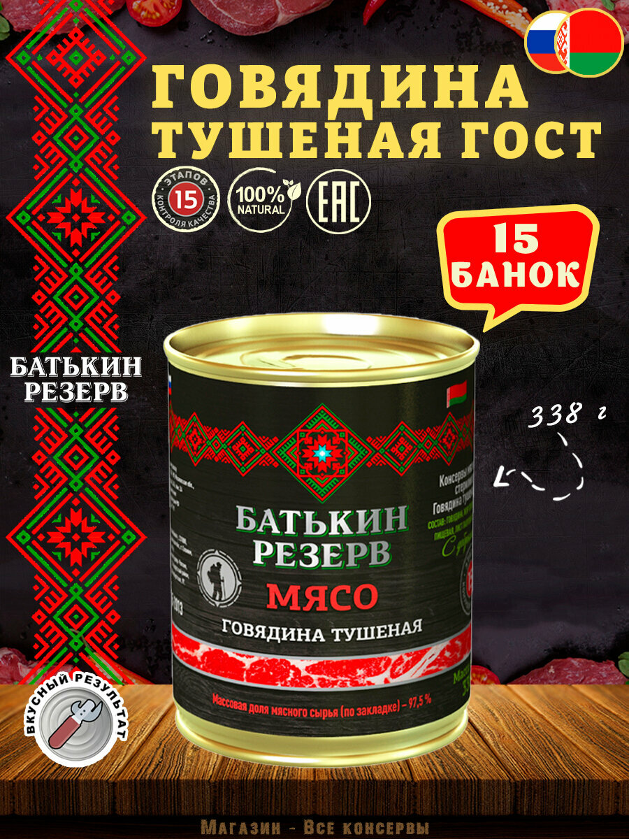 Говядина тушеная Батькин резерв ГОСТ 15 шт по 338 г: сравнение цен, характеристики, фото, актуальное наличие и цены.
