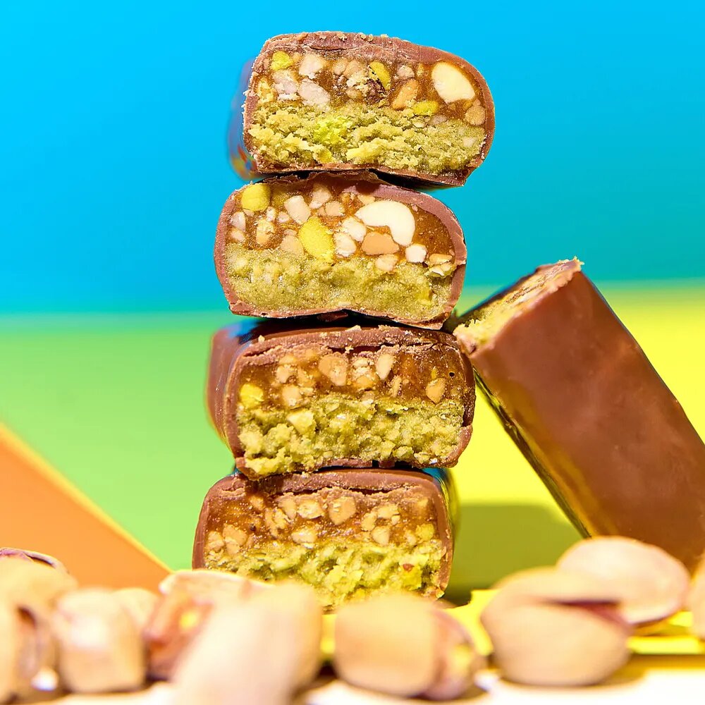 | Состав | Фисташки, водорастворимые волокна кукурузы, олигофруктоза (пищевые волокна), молочный шоколад (водорастворимые волокна кукурузы, масло какао, какао тертое, молоко сухое обезжиренное, эмульгатор (соевый лецитин), ароматизаторы натуральные, подсластитель (сукралоза)), вода, масло кокосовое, концентрат сывороточного белка, агент влагоудерживающий (глицерин), подсластитель (сорбит), соль морская, ароматизаторы натуральные, регулятор кислотности (лимонная кислота), антиокислитель (аскорбиновая кислота), эмульгатор (соевый лецитин), натуральный краситель (сахарный колер), консервант (сорбат калия), натуральный подсластитель (стевия). |