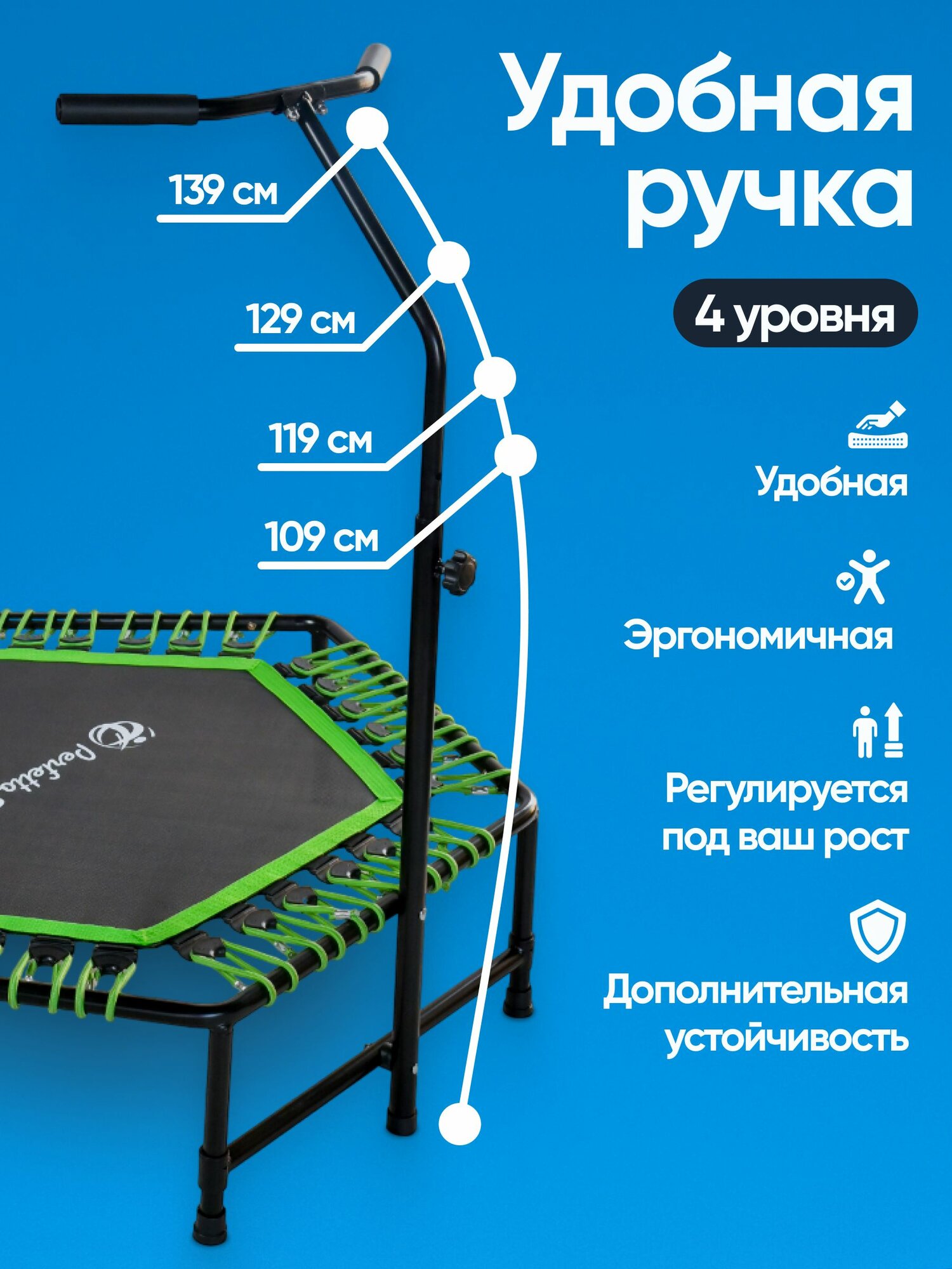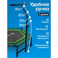 Регулируемая ручка переходящая в 7-ю дополнительную устойчивую ножку Высота прыжкового полотна: 28 см