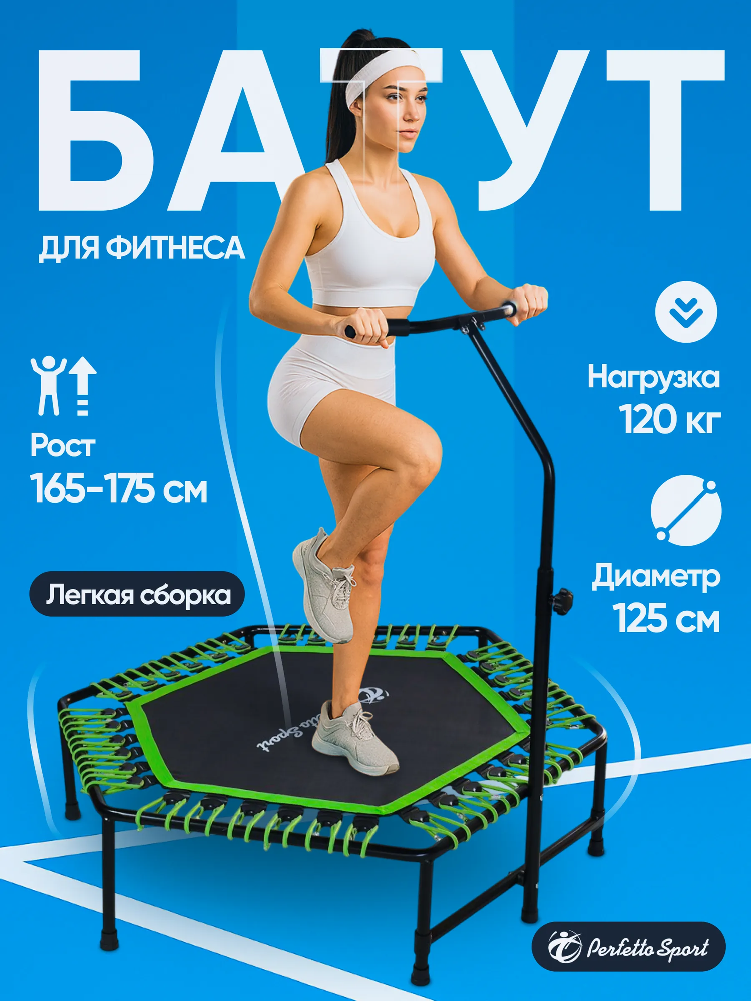 Батут PERFETTO SPORT «FITNESS» разработан специально для занятий Джампингом/Jumping, имеет стальной каркас, противоскользящие ножки, эластичные пружины, надёжное прыжковое полотно, регулируемую ручку, которая упирается в пол и обеспечивает дополнительную устойчивость батуту