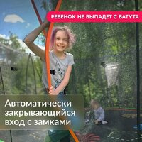 Вход на батут исполнен в виде «клапана». После натяжения сетки он остается закрытым и блокирует любую возможность выпадения из батута. Можно не беспокоиться, что ребенок забудет закрыть молнию за собой.