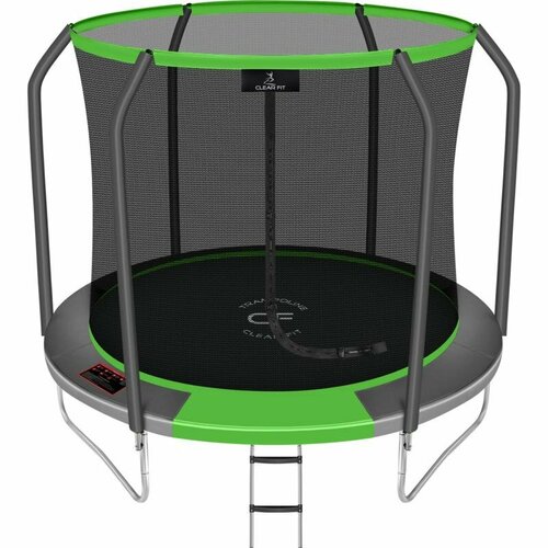 Каркасный батут с защитной сеткой Clear Fit серии GreenHop — отличаются комфортом и надежностью. Надежная рама из качественных комплектующих, прочная защитная сеть снабжена прямым креплением к прыжковому полотну и дополнительной защитой входа, наверху каркасное жесткое крепление, сеть не провисает и не слетает во время тренировок. Увлекательный, полезный и безопасный тренажер для всей семьи. Батуты серии GreenHop 10Ft, 12Ft, 14Ft и 16Ft поставляются в оптимальной для комфорта и безопасности комплектации: батут, верхняя защитная сеть, защитный мат и лестница. Благодаря размеру батута в 10 футов и диаметру прыжковой поверхности 2.62 м он идеально подходит для дачного участка, размеры полотна позволяют комфортно тренироваться взрослым и развлекаться детям любого возраста. Верхняя защитная сеть оберегает от падений, усиленная молния и дополнительная защита входа уберегут малышей от случайного входа или падения. Надежный каркас из оцинкованной стали, качественные комплектующие и погодостойкие гальванизированные метизы рамы делают батут безопасным, устойчивым, надежным, гарантируют полную защиту от коррозии и долгий срок службы. Максимальный вес пользователя батута GreenHop 10Ft — до 150 кг. Батуты GreenHop предназначены не только для детских игр, но и для фитнеса. Благодаря инновационной системе крепления защитной сети значительно увеличено рабочее пространство и надежность конструкции. Тренировки на батуте — это отличная аэробная нагрузка: улучшение общей физической формы, заряд положительных эмоций, улучшение работы кардиоваскулярной системы, развитие чувства равновесия и координации в пространстве для пользователей любого возраста. Занятия на свежем воздухе укрепляют иммунитет, снабжают организм кислородом, повышают выносливость как у детей, так и у взрослых. Именно поэтому мы используем только высококачественные комплектующие с большим запасом прочности. В большинстве случаев батуты данного типа устанавливаются под открытым небом, обязательные требования к материалам — это влагостойкость, термоустойчивость, в том числе и к низким температурам, переносимость ультрафиолетовых лучей и износостойкость. Конструкция для обеспечения безопасности выполнена из гальванизированной стали, диаметр стальных труб W-опор и каркаса - 38 мм. Каркас из труб толщиной 1.2 мм легко соединяется, опоры крепятся в приваренные к каркасу основания, все соединения изготовлены из высококачественных гальванизированных метизов. Качественная двойная оцинковка всех труб конструкции исключает коррозию, увеличивает срок эксплуатации батута. Прыжковое полотно — это основной элемент батута. Материал прыжкового полотна Перматрон (Permatron) — эластичный материал, способный возвращаться в исходное состояние при постоянном воздействии с разным усилием. Термообработка волокон материала обеспечивает высокую прочность на разрыв и стрессоустойчивость материала. Это влагостойкий, эластичный термоустойчивый материал, не поддающийся распаду от ультрафиолета. Пружины выполнены из.