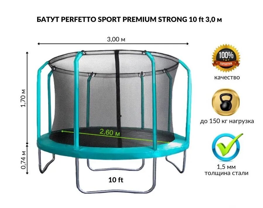 | Подробная комплектация | батут, стойки для защитной сети, защитная сетка, чехлы на стойки сетки |