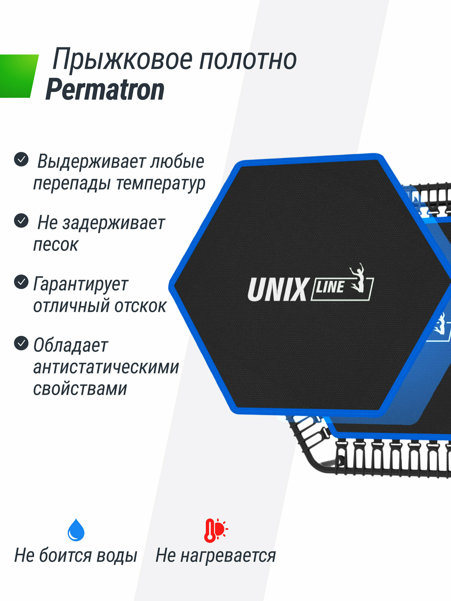 Спортивный батут для фитнеса UNIX Line Fitness – это простота и легкость сборки, высокая безопасность и качественные материалы. Спортивный батут подойдет для занятий Джампингом (Jumping). Джампинг - это фитнес-программа и упражнения, которые выполняются на круглых батутах со специальными опорами. Это сочетание аэробной и силовой нагрузки, а также упражнения на баланс и растяжку. Упражнения на батуте помогают улучшить работу сердечно-сосудистой и лимфатической систем. Одно из основных преимуществ батута для фитнеса заключается в том, что он позволяет выполнять кардиотренировки без нагрузки на суставы, что делает его идеальным выбором для тех, у кого есть проблемы с суставами или травмы. Мощная шестиугольная рама с толщиной стали 1.5 мм и дополнительная горизонтальная поперечина придает жесткость конструкции и позволяет выдерживать самые продолжительные и интенсивные тренировки. Модель UNIX Line FITNESS Lite предназначена как для групповых занятий, так и для домашних тренировок. Максимальный вес пользователя составляет 130 кг. Прыжковое полотно из материала Permatron соединяется с рамой с помощью 42-х переплетов бесшумного жгута. Permatron – эластичный материал, легко возвращающийся в исходное состояние при постоянном воздействии с разной нагрузкой. Он устойчив к внешним воздействиям: ультрафиолету, плесени, влаге, резким изменениям температуры. Термическая обработка делает эту ткань устойчивой к постоянным изгибам и стрессовым нагрузкам. Прыжковое полотно для батута, изготовленное из перматрона, подходит для применения дома и на улице. Этот материал не боится осадков и воздействия солнечных лучей, также обладает антистатическими свойствами. Батут для фитнеса складной поможет весело провести время, снять стресс, улучшить координацию, укрепить мышцы тела и избавиться от лишнего веса. Батут можно использовать не только взрослым, но и детям в качестве развлечения, он не занимает много места и станет приятным необычным времяпрепровождением.