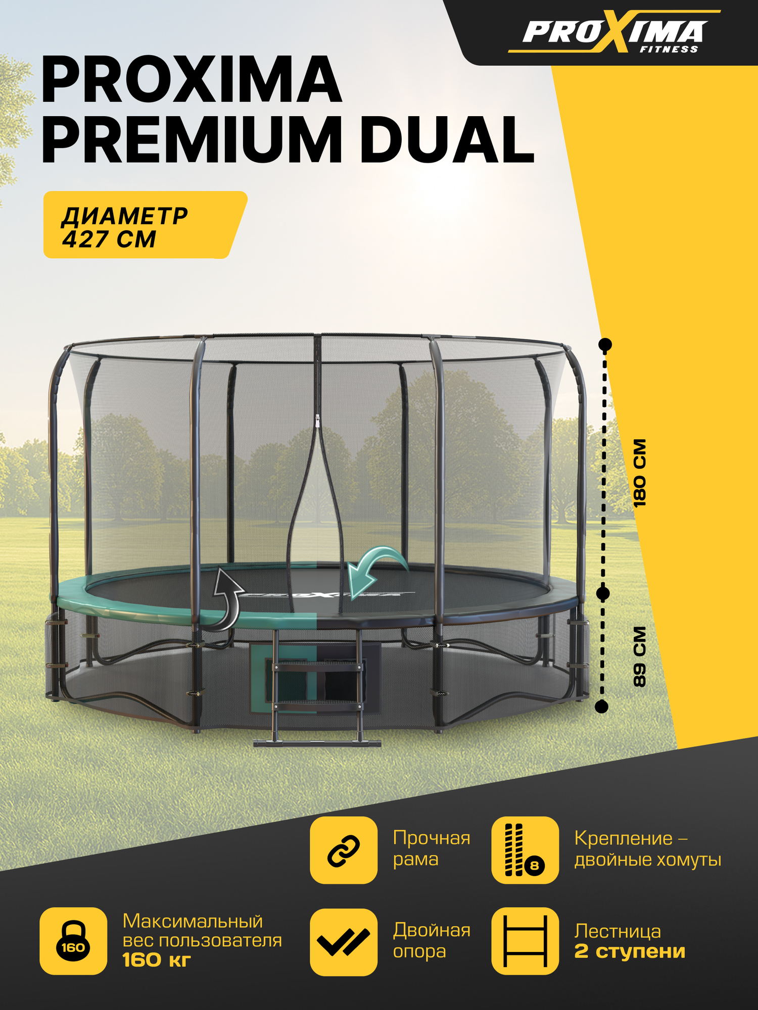 Батут каркасный Proxima Premium Dual 14 ft (427 см) с верхней и нижней сетками и лестницей, Арт. CFR-14FT-4W: сравнение цен, характеристики, фото, актуальное наличие и цены.
