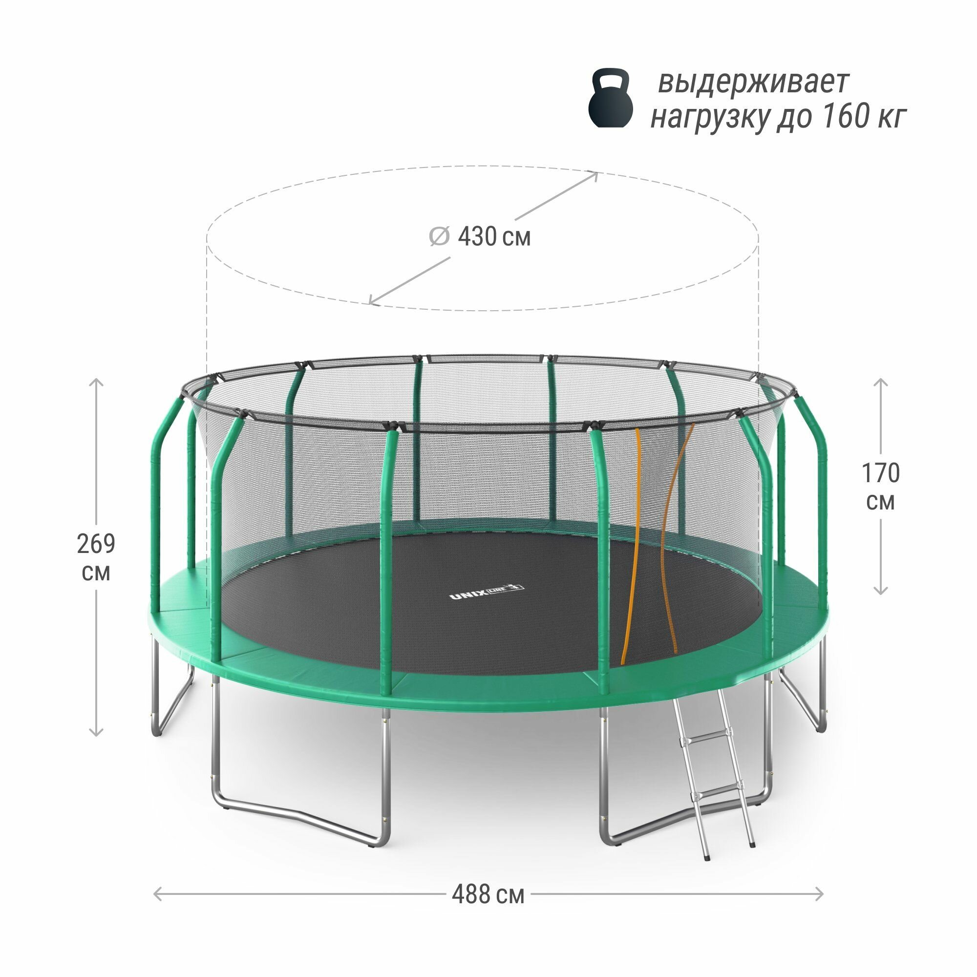 Батут Unix Line Supreme Basic 16 ft (green) - модель из новой линейки от Unix. Имеет следующие ключевые особенности: защитная сеть повышенной прочности, мягкий защитный мат, прыжковое полотно из профессионального материала, устойчивого к воздействию окружающей среды, надежные износостойкие пружины, рама из высокопрочной стали. Поставляется в комплекте с лестницей для удобного подъема.