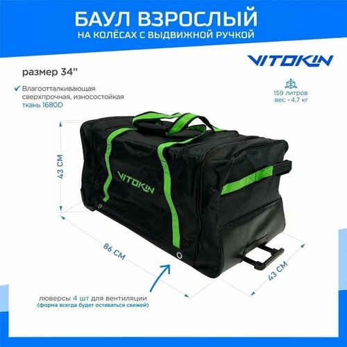 Баул хоккейный на колесах с выдвижной ручкой VITOKIN - это специальная сумка, предназначенная для переноски и хранения спортивного снаряжения хоккеиста.