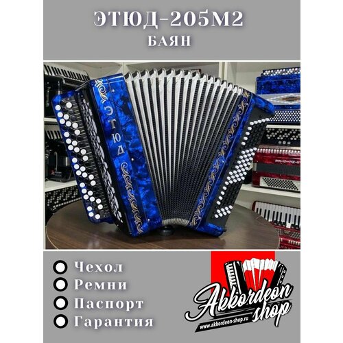 Баян БН-40 "Этюд-205М2" Баян специально разработан для учащихся музыкальных школ. Инструмент имеет классический корпус с вставным грифом, у такого расположения грифа более удобная постановка руки при обучении. Баян "Этюд-205М2" имеет 3-х рядную, двухголосную правую механику. В левой механике находятся 100 басовых кнопок расположенных в 5 рядов. Кусковая голосовая планка выполнена из дюралюминия и шведской стали.