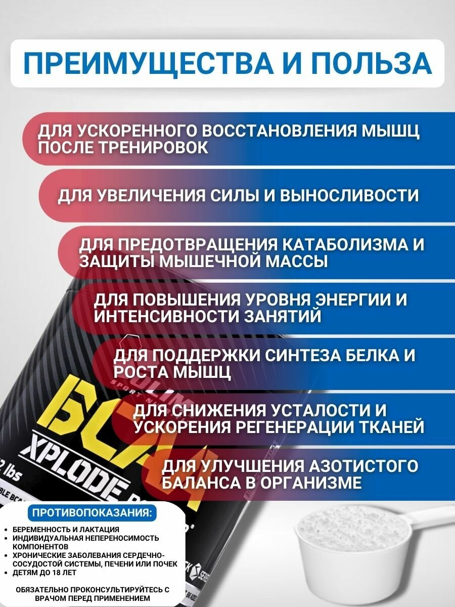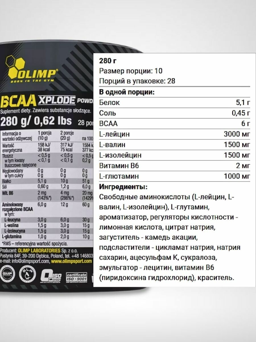 Olimp BCAA XPLODE будет способствовать синтезу белка, повышать мышечную выносливость, защищать мышечную ткань от разрушения кортизолом, сжигать жир, повышать количество глютамина в мышцах и укреплять иммунитет.