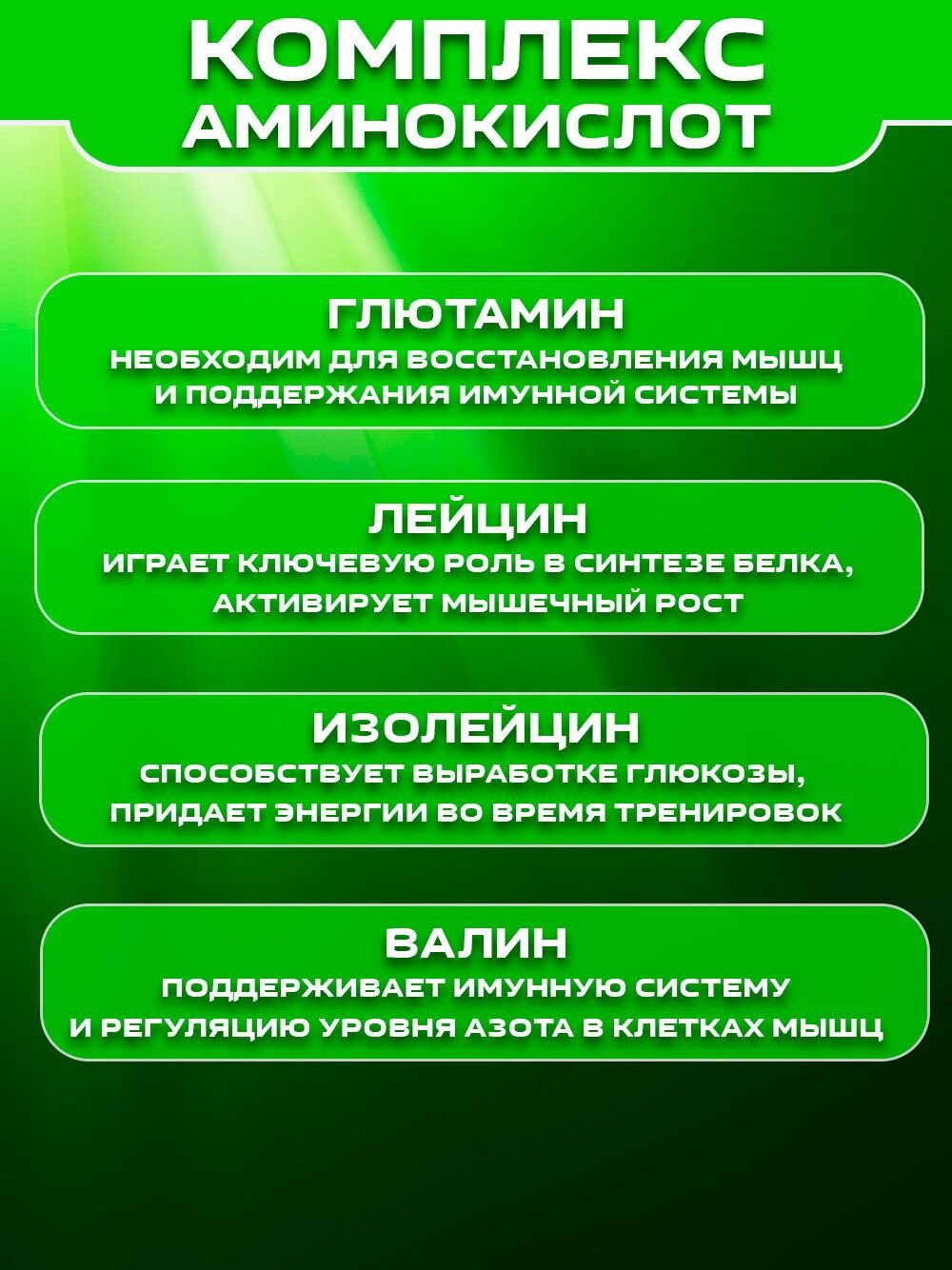 Высокая доза глютамина и ВСАА 1:1 обеспечивает эффективное восстановление мышц после интенсивных тренировок, а также препятствует распаду мышц и снижению производительности.