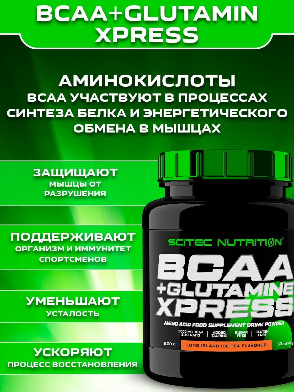 Комплекс BCAA + Glutamine Xpress от Scitec Nutrition содержит в одной порции большое количество BCAA и глютамина. Причем находятся они в соотношении 1:1, по 5 г BCAA и глютамина на каждую порцию.