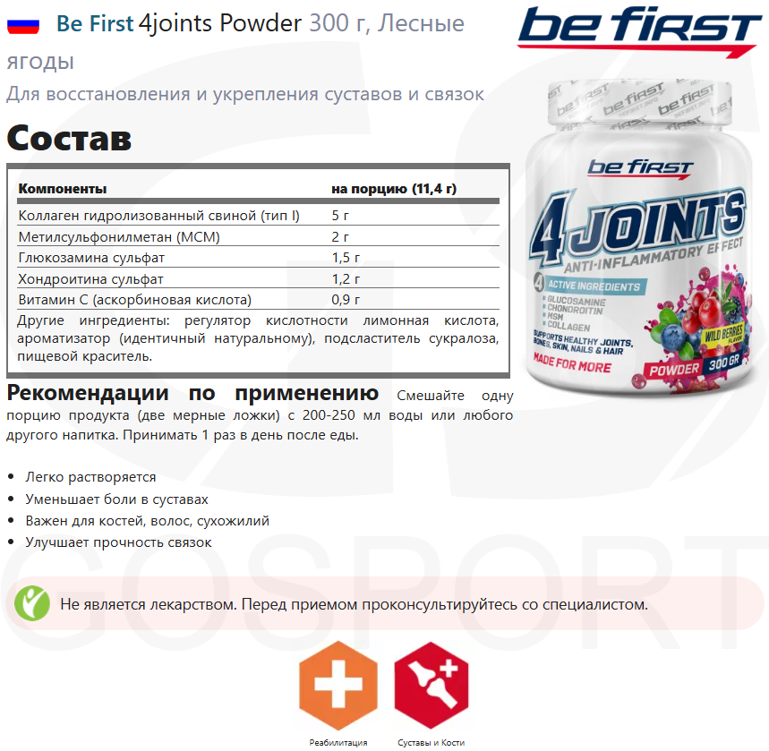 Be First 4joints Powder 300 г, Лесные ягоды: сравнение цен, характеристики, фото, актуальное наличие и цены.