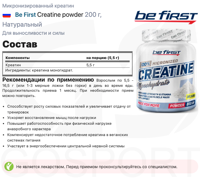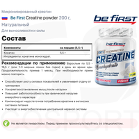 Be First Creatine powder 200 г, Натуральный: сравнение цен, характеристики, фото, актуальное наличие и цены.