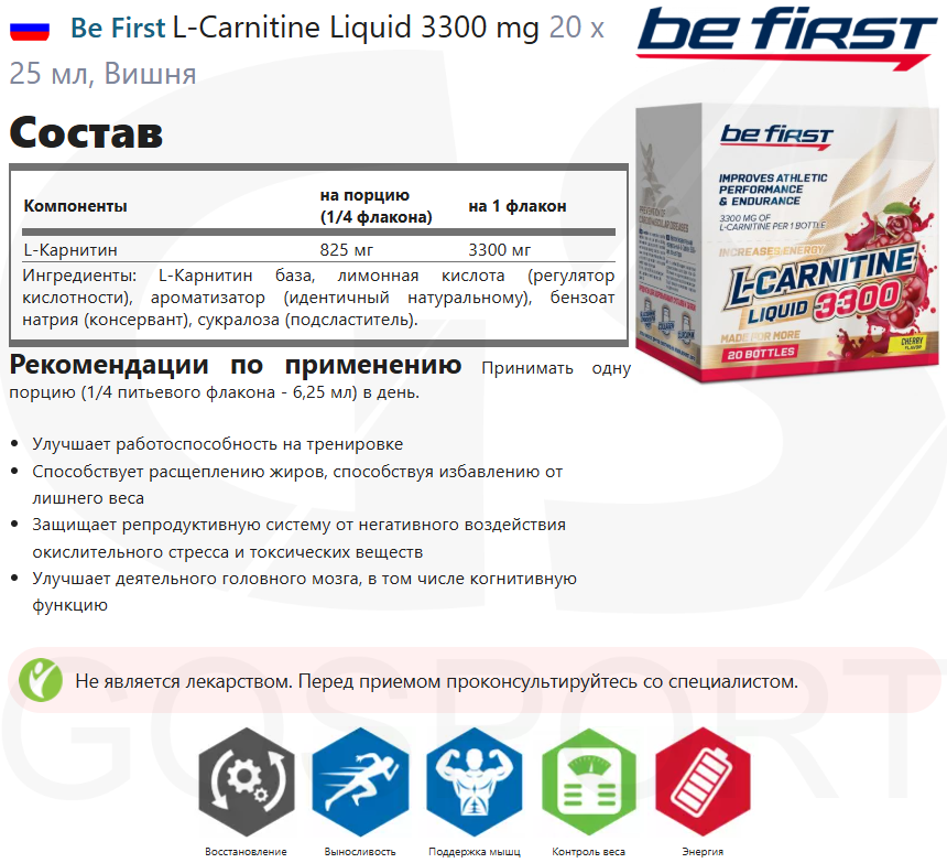 Be First L-Carnitine Liquid 3300 mg 20 х 25 мл, Вишня: сравнение цен, характеристики, фото, актуальное наличие и цены.