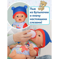 У куклы 10 интерактивных функций: закрывает глаза, если повернуть во рту куклы соску, спит с закрытыми глазами, умеет пить из бутылочки, плачет настоящими слезами, писает в подгузник и в горшок, умеет есть с ложечки, можно купать, суперподвижная, быстрее сохнет.