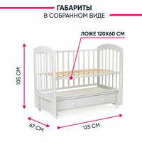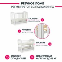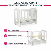 Кровать Bebizaro Regency (Бебизаро Регенси) - красивая кроватка для ребенка с рождения до 3-4 лет с универсальным маятником и вместительным ящиком под кроваткой. Это функциональная кроватка, продуманная до мелочей. Она обеспечит максимальный комфорт и безопасность для вашего малыша. Каркас кроватки выполнен из массива берёзы. Для удобства родителям, боковая стенка кроватки регулируется по высоте. Модель оборудована вместительным и практичным ящиком для хранения, а также колесами для её перемещения по комнате.