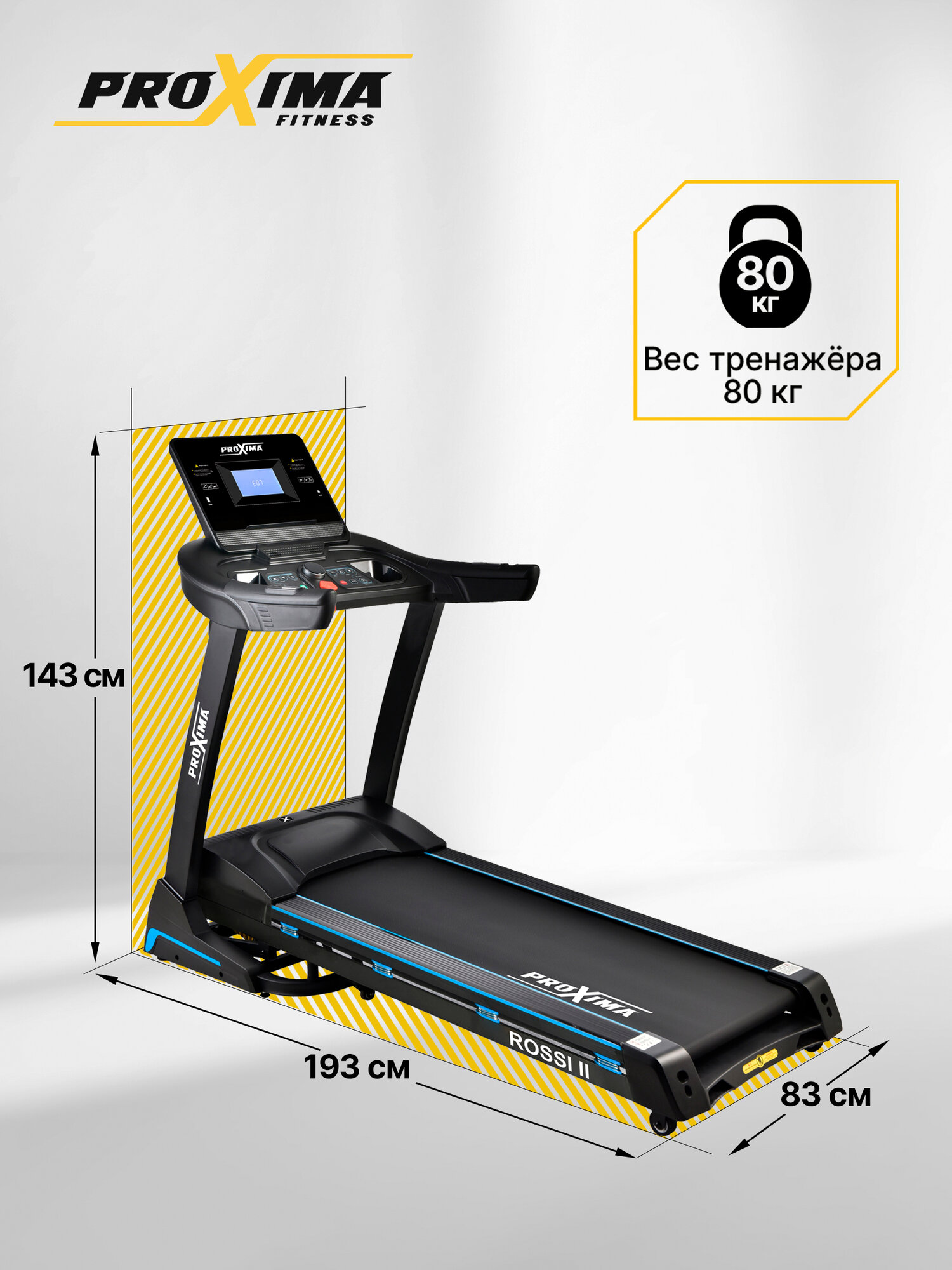 Электрическая беговая дорожка Proxima Rossi II – это идеальное сочетание всего необходимого функционала для эффективных кардио-тренировок. Просторное беговое полотно, мощный двигатель, хорошая амортизация и это далеко не весь список преимуществ этой дорожки.