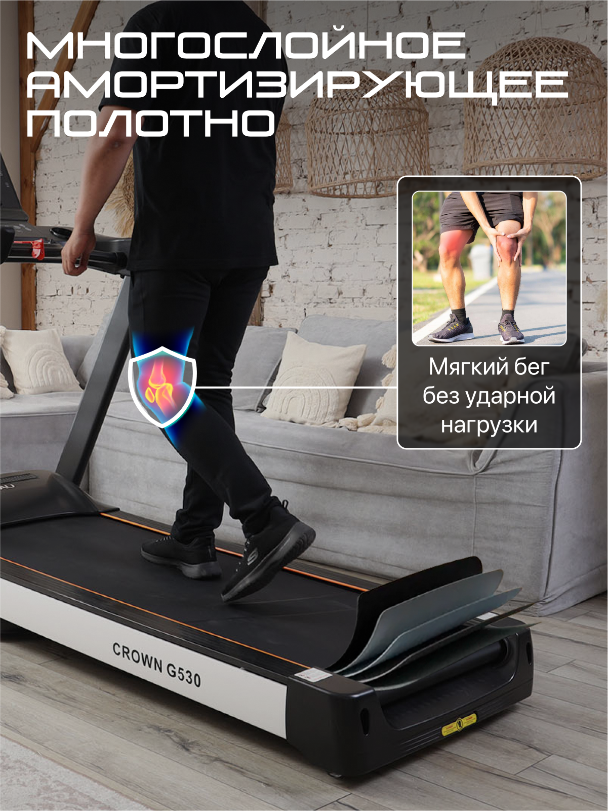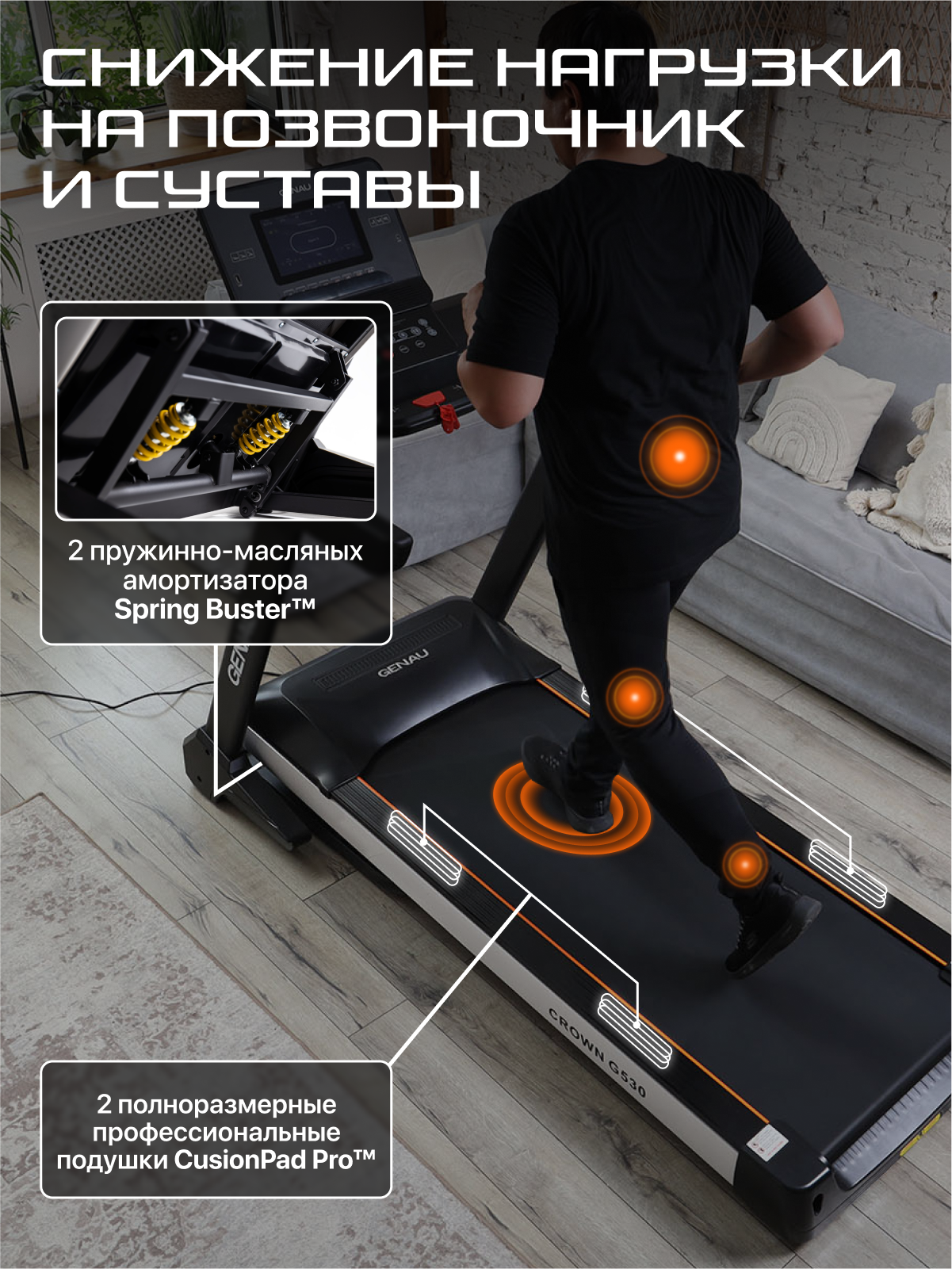 Модель Genau Crown G530 оснащена четырехслойным полотном с системой поглощения удара CCMD SOFT DECK, 2 полноразмерные профессиональные подушки CusionPad Pro, 2 пружинно-масляных амортизатора Spring Buster снижают ударную нагрузку на позвоночник и суставы;