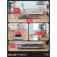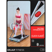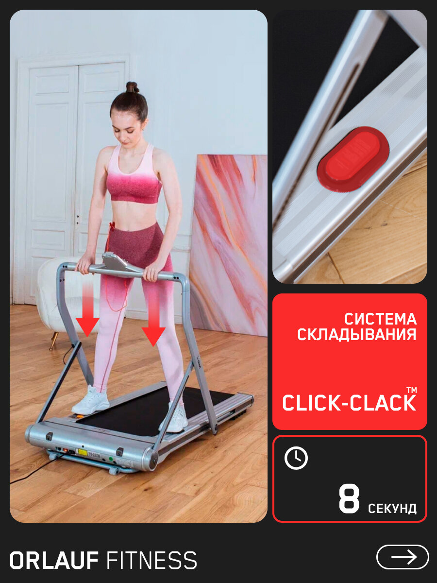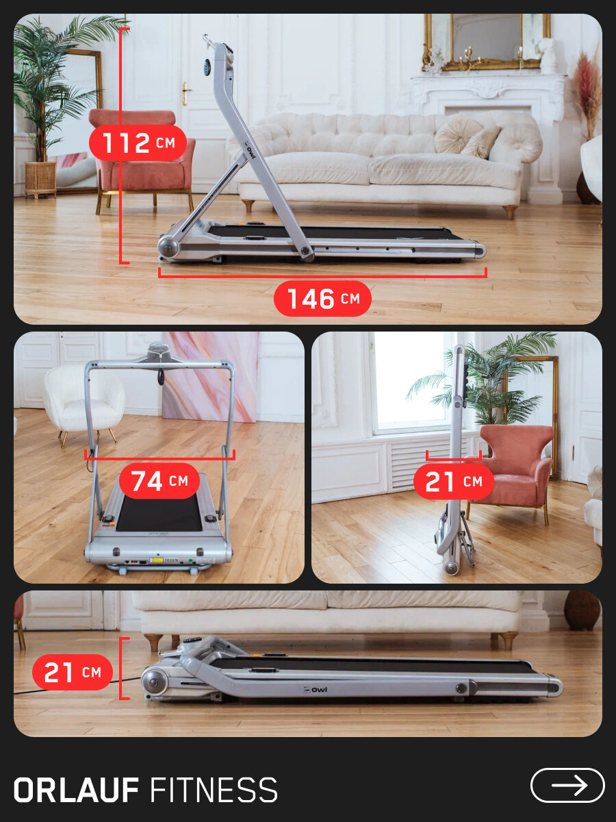 Orlauf Owl отличается ультракомпактными размерами и удобной системой складывания Click-Clack. В сложенном виде толщина дорожки составляет всего 21 см, что позволяет хранить ее как горизонтально, например, под кроватью, так и вертикально. Подножка автоматически выдвигается при вертикальном положении и складывается при опускании тренажера, что делает хранение и использование еще удобнее.