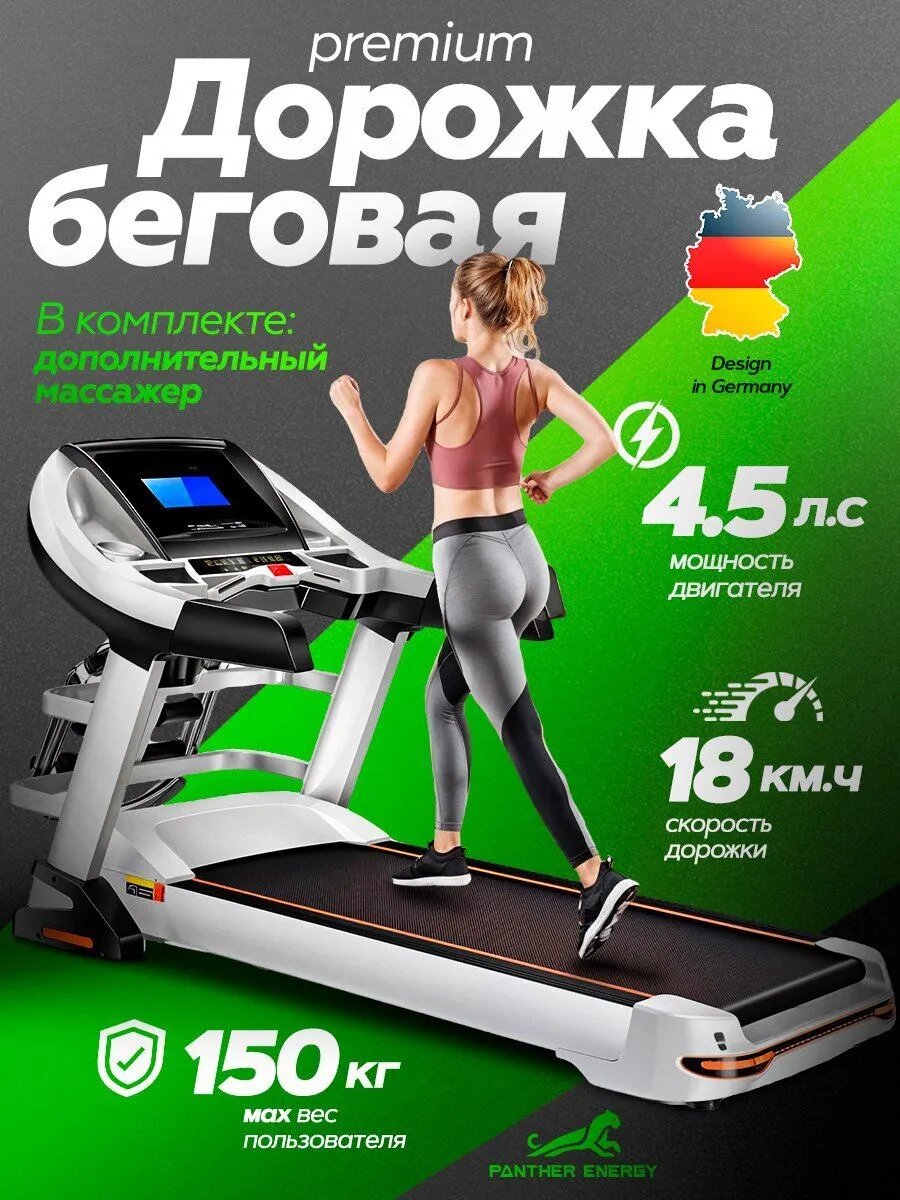 Профессиональная беговая дорожка PANTHER ENERGY: комфорт и эффективность тренировок Электрическая беговая дорожка PANTHER ENERGY предназначена для пользователей с максимальным весом до 150 кг. Она обеспечивает плавный и бесшумный ход, позволяя заниматься в любое время суток без беспокойства для окружающих. Широкий выбор программ тренировки PANTHER ENERGY предлагает 30 программ тренировки, адаптированных под индивидуальные цели и уровень подготовки пользователя. Это позволяет подобрать наиболее комфортный режим для каждой тренировки. Основные функции беговой дорожки включают различные уровни наклона и скорости, цветной дисплей, систему амортизации, подставку для стакана и планшета, компенсаторы неровности пола, противоскользящее покрытие и беспроводное подключение к устройствам через Bluetooth. Стильный дизайн и компактность Беговая дорожка выполнена в черном и белом цветах, имеет стильный дизайн и компактные размеры, что позволяет гармонично вписать ее в любой интерьер. Складная конструкция облегчает хранение и транспортировку. Безопасность и комфорт Встроенный светодиодный дисплей информирует о времени, дистанции, сожженных калориях и других показателях тренировки. Противоскользящее покрытие и подставка для стакана обеспечивают безопасность и комфорт во время занятий. Не упустите возможность быть активным и поддерживать свою физическую форму, не выходя за пределы вашего жилья.