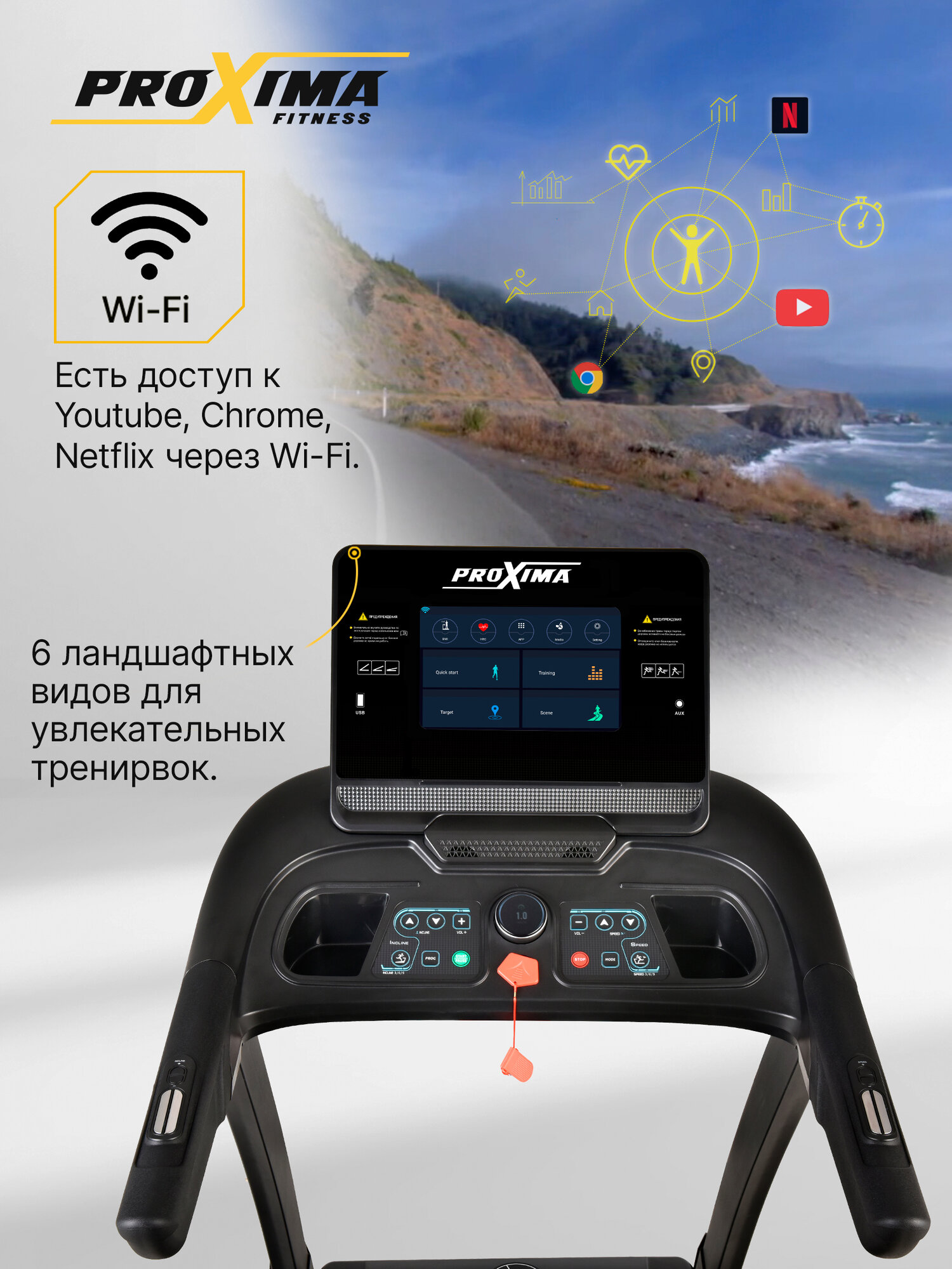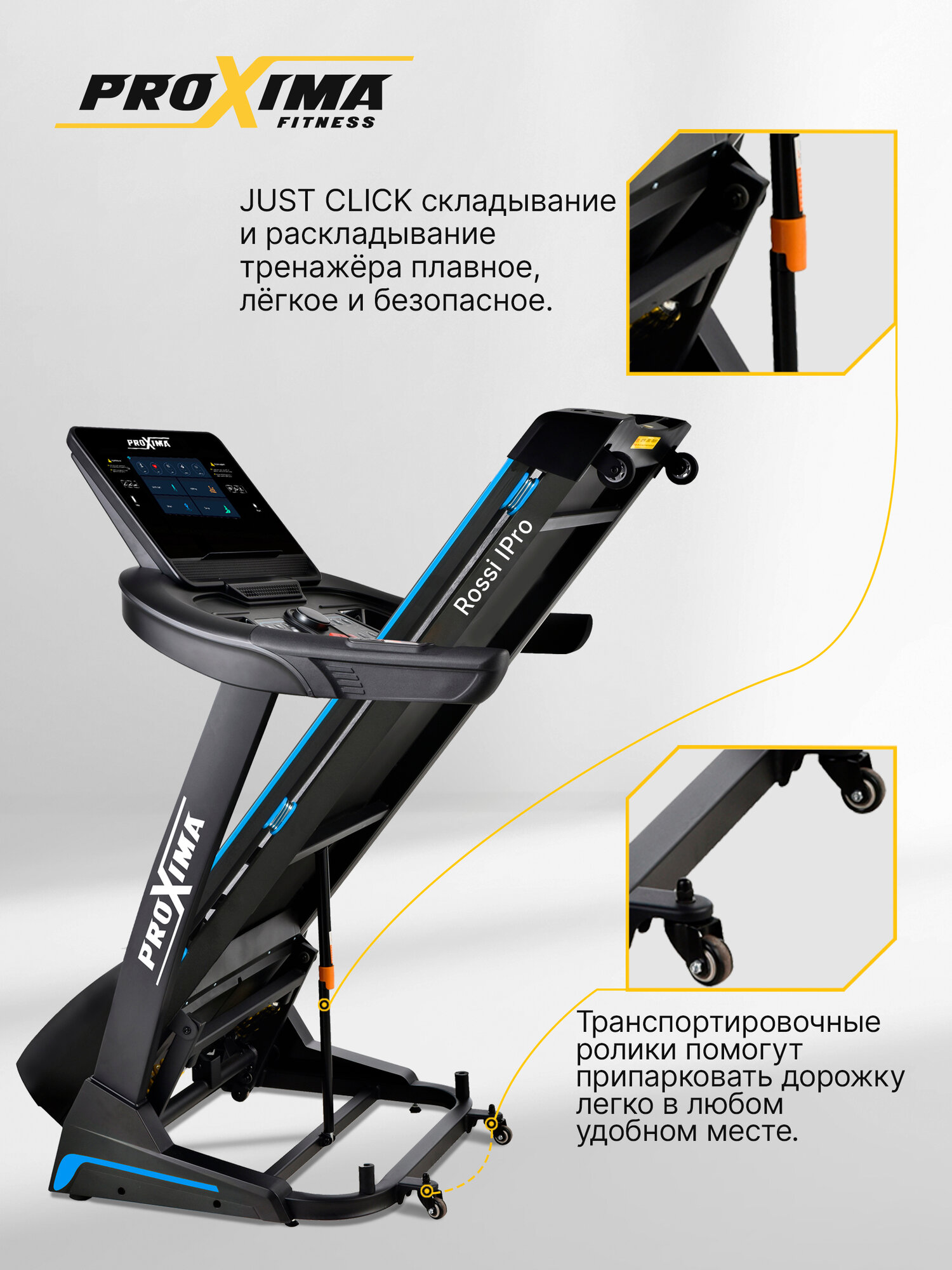 | Особенности | компенсаторы неровности пола, подставка для стакана, подставка под планшет, противоскользящее покрытие, светодиодный дисплей, сенсорный дисплей, система амортизации, складная, транспортировочные ролики/колеса, цветной дисплей |