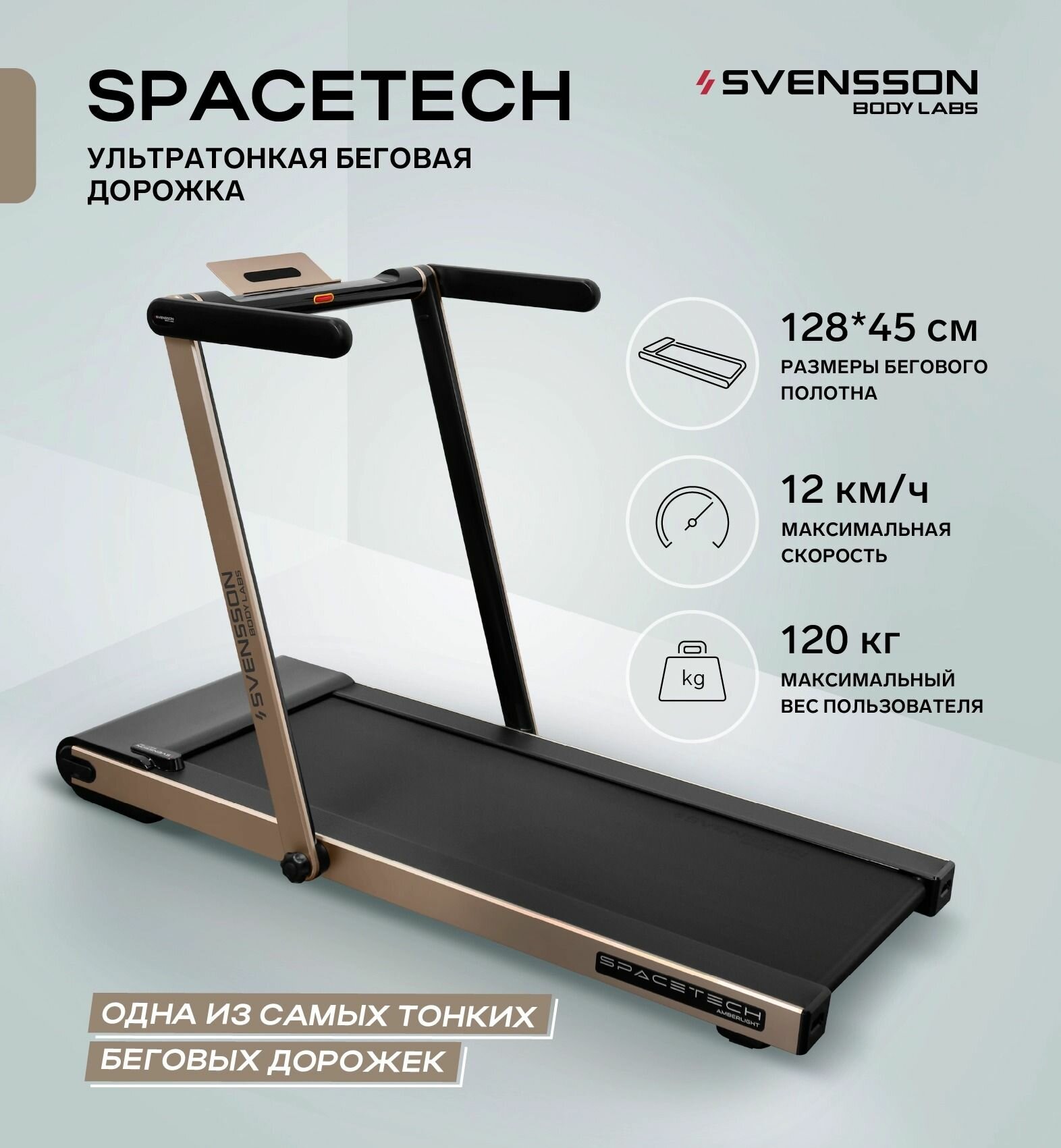 SVENSSON BODY LABS SPACETECH (AMBERLIGHT) – электрическая беговая дорожка от шведской компании Jörgen Svensson. Модель рассчитана на пользователей, имеющих начальный и средний уровень физической подготовки. Подходит для регулярных кардиоупражнений. На тренажере могут заниматься бегуны, имеющие вес до 120 кг.