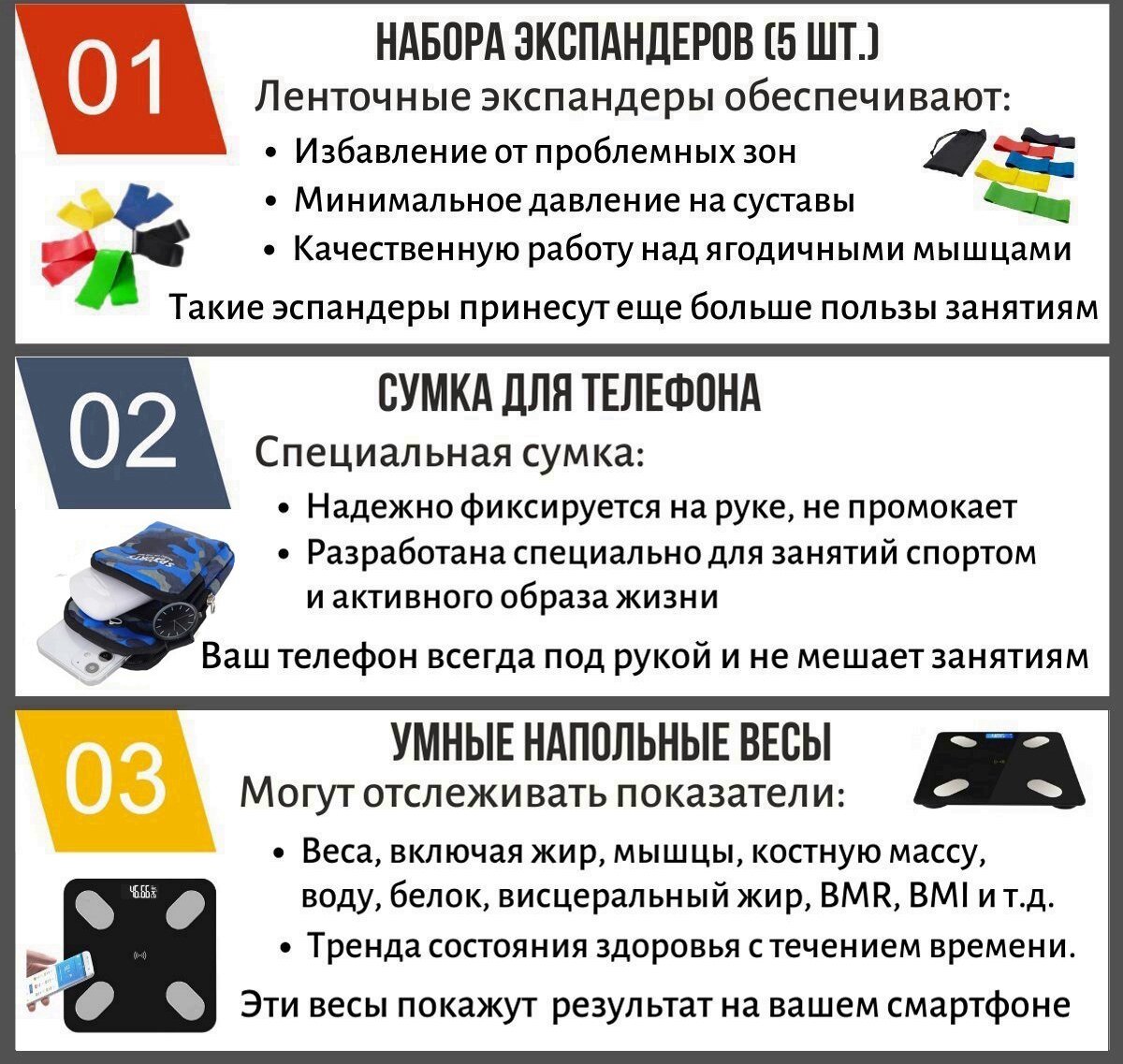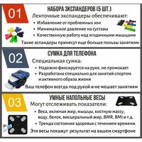 В набор к беговой дорожке входят: сумка для телефона с креплением на руку, набор экспандеров и умные напольные весы. Этот набор принесет еще больше пользы вашим тренировкам.