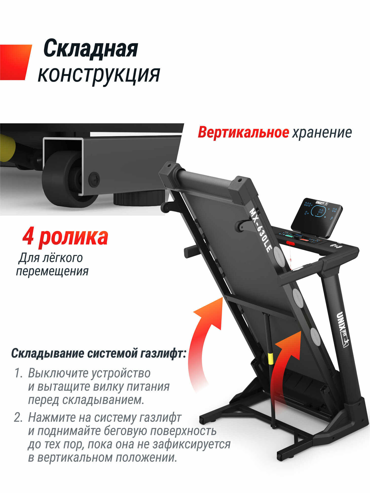 Важным преимуществом данной модели является её небольшие габариты 160 х 75 х 125 см и вес 48 кг. Складная конструкция с системой газлифт помогает сэкономить пространство, позволяя быстро убрать тренажёр после окончания занятия. Удобство перемещения обеспечивают четыре транспортировочных ролика. Размер в сложенном виде 169 х 76 х 29,5 см.