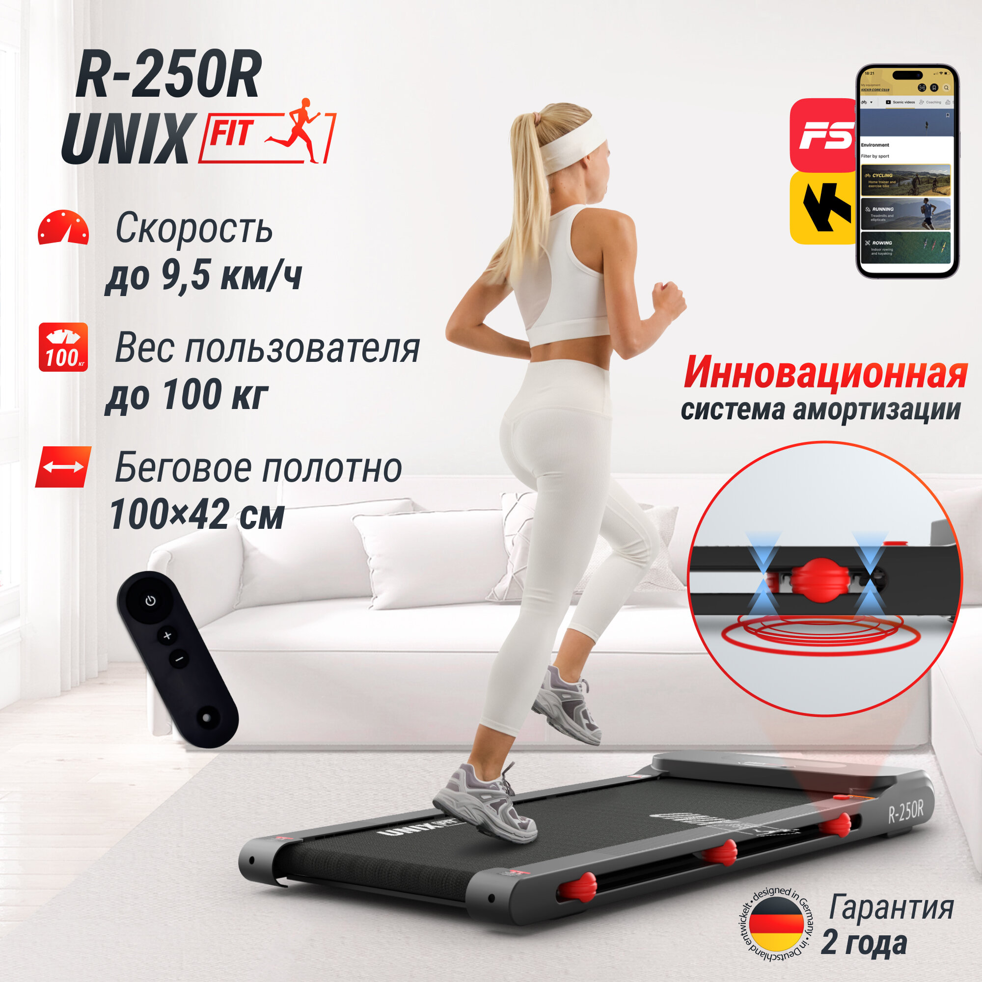 | Дополнительная информация | Дека 15 мм., фитнес приложение FitShow для синхронизации с мобильным устройством и записи тренировок, 6 пружинных эластомеров с силиконовыми демпфирующими подушечками ElasticShok (снижают нагрузку на позвоночник и суставы), система охлаждения двигателя |