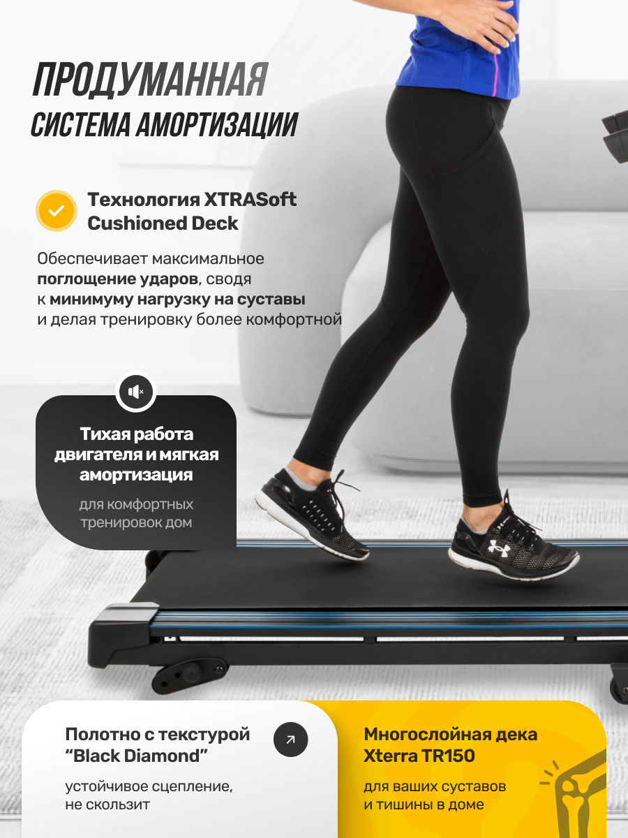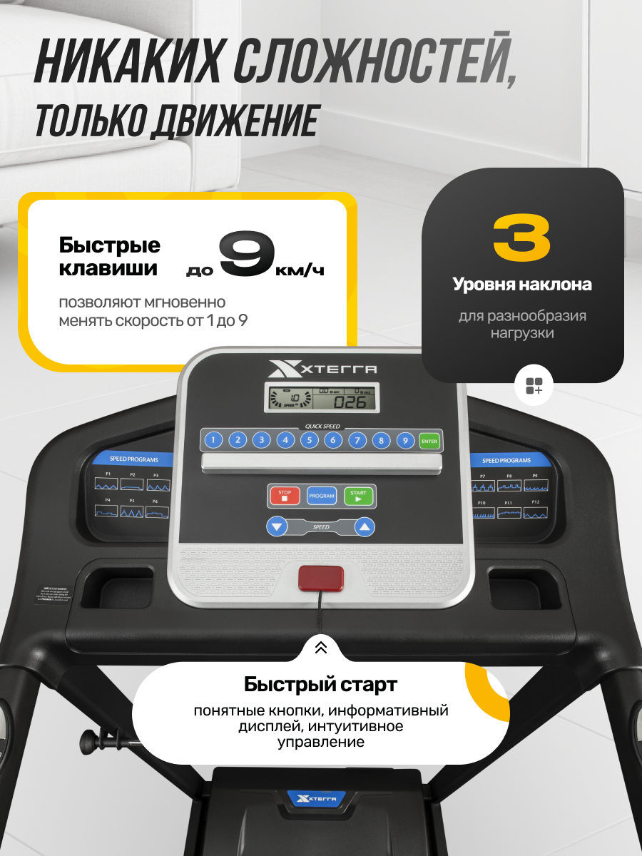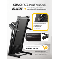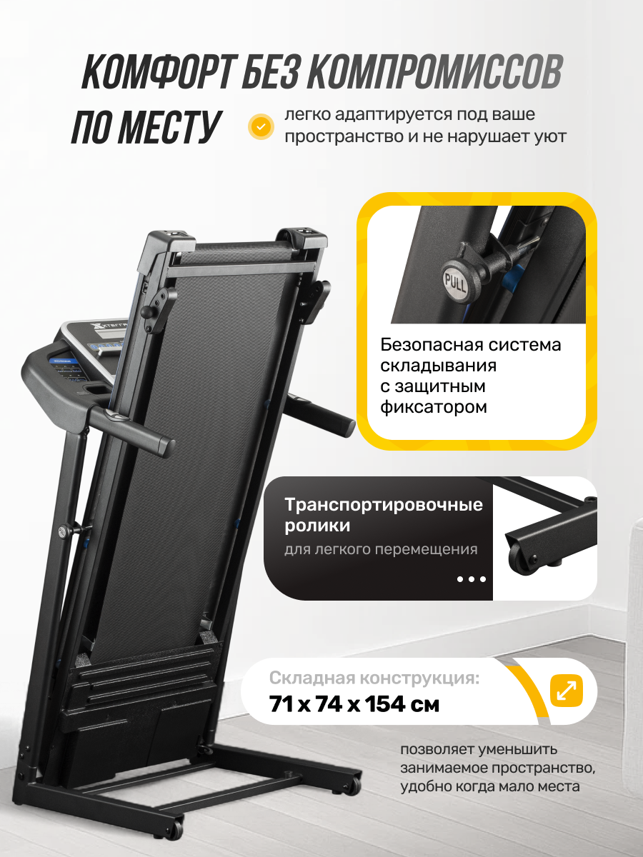 | Дополнительная информация | дисплей LCD 5", встроенный кардиодатчик в ручках, подставка для телефона/планшета, три уровня наклона, номинальное напряжение 220В, диаметр вала передний/задний 41,5/41,5 мм, дека 15 мм, одна пользовательская программа, размеры в сложенном виде (ДхШхВ) 71х74х154 см, амортизация с помощью 6 упругих эластомеров, две подставки для бутылок |