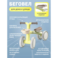 Детский беговел с практичной корзинкой для хранения разных предметов прекрасно подходит для катания как дома, так и на свежем воздухе. Благодаря бесшумным колёсам из этиленвинилацетата (EVA), оставляющим минимум следов, облегчённой раме из пластика, комфортному сиденью и не скользящему рулю, ребёнок получает максимальное удовольствие от каждой поездки. Лёгкая конструкция беговела (весом всего 2,1 кг) обеспечивает простоту управления, а дополнительное четвёртое колесо гарантирует повышенную устойчивость и снижает риск падений, делая катание безопаснее.