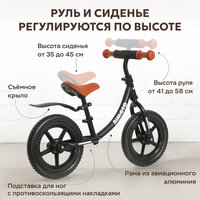 Сверхлёгкая алюминиевая рама рассчитана на повышенную нагрузку. Прочная рама из авиационного алюминия имеет травма защитную накладку на руль. Алюминиевые быстросъёмные (эксцентриковые зажимы) для быстрой и удобной регулировки руля и сиденья без использования инструментов. Беговел удобно переносить, а если малыш устанет — взрослому будет не тяжело нести его в руках.