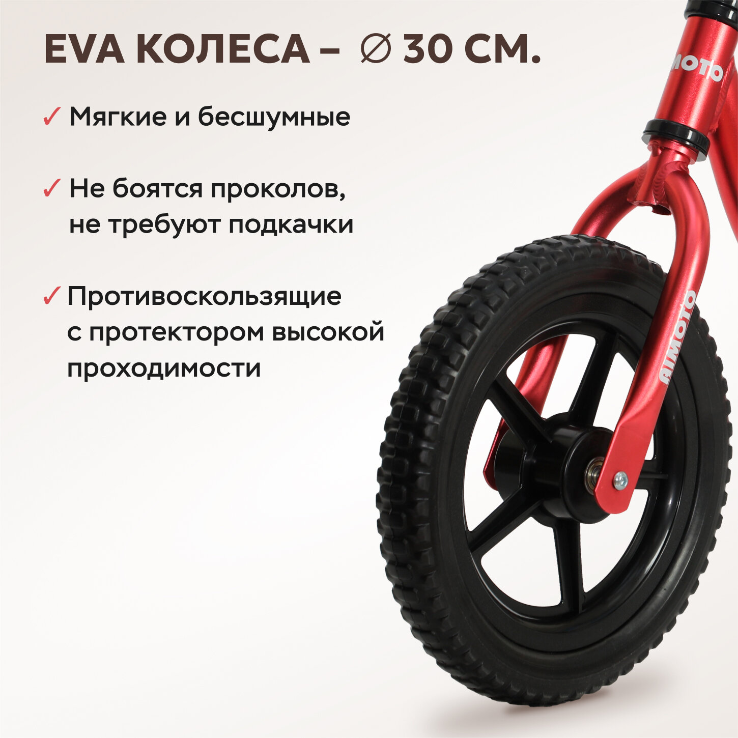 Резиновые колеса (диаметр 30,5 см) — обеспечивают мягкое и плавное движение, сглаживают неровности дороги и не шумят. Кататься комфортно как по асфальту, так и по плитке или тропинке. Беговел 12 дюймов колеса EVA - не требуют подкачки, мягкие, противоскользящие и бесшумные, не боятся проколов. Колеса с протектором высокой проходимости.