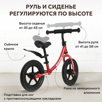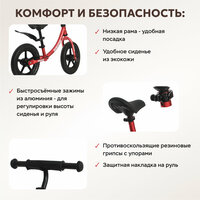 Сверхлёгкая алюминиевая рама рассчитана на повышенную нагрузку. Прочная рама из авиационного алюминия имеет травма защитную накладку на руль. Алюминиевые быстросъёмные (эксцентриковые зажимы) для быстрой и удобной регулировки руля и сиденья без использования инструментов. Беговел удобно переносить, а если малыш устанет — взрослому будет не тяжело нести его в руках.
