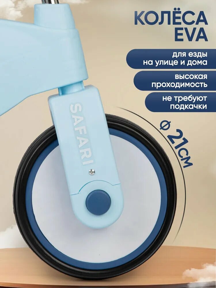 • Колёса EVA — мягкие, не шумят по полу, не требуют подкачки