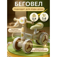 Беговел детский оснащен подсветкой, музыкой и защитой от опрокидывания, что делает его многофункциональным и увлекательным.