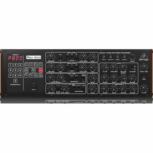 Behringer Pro-800 - полифонический 8-голосный синтезатор на основе Prophet 600. Классический аналоговый 8-голосный полифонический синтезатор с 2 VCO, классическим VCF, арпеджиатором, секвенсором и 400 программами памяти. Основанный на классическом Prophet 600, этот синтезатор передает винтажные звуки оригинала в сочетании с некоторыми современными функциями, такими как MIDI и встроенная память. Каждый из 8 голосов также содержит 2 VCO для создания массивных звуков. Режим Unison на PRO-800 также позволяет создавать приятные насыщенные 16-осцилляторные соло- и басовые звуки. Объедините это с возможностью одновременного использования до 6 отдельно настраиваемых форм осцилляторов (OSC A и B: пила, треугольник и импульс). Вы сможете создавать потрясающие соло или огромные басовые тембры. Функция «POLY MOD» даже позволяет OSC B модулировать OSC A. На PRO-800 можно сохранить до 400 патчей, просто введите номер программы с клавиатуры, и ваш патч будет готов к действию. PRO-800 предназначен для установки в стандартный корпус Eurorack. Просто подключите силовые кабели к источнику питания и закрепите модуль с помощью прилагаемых винтов. Это позволяет смешивать PRO-800 с другими синтезаторными модулями для создания поистине уникальной конфигурации.