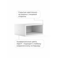 Навесная прикроватная тумба станет прекрасным завершающим элементом интерьера вашей спальной комнаты. "Парящая" мебель - отличное решение для небольших помещений - добавит интерьеру легкости и стиля, облегчает процесс уборки. Компактная и лаконичная подвесная тумба делает композицию визуально легче. Тумба надежно крепится к стене, вся фурнитура входит в комплект к изделию. Каркас тумбочки выполнен из ЛДСП 16 мм. Отличительной особенностью полки являются скрытые крепления, которых не видно с лицевой стороны. Навесная прикроватная тумба одос отлично дополняет коллекции мягкой и корпусной мебели MONOFIX.