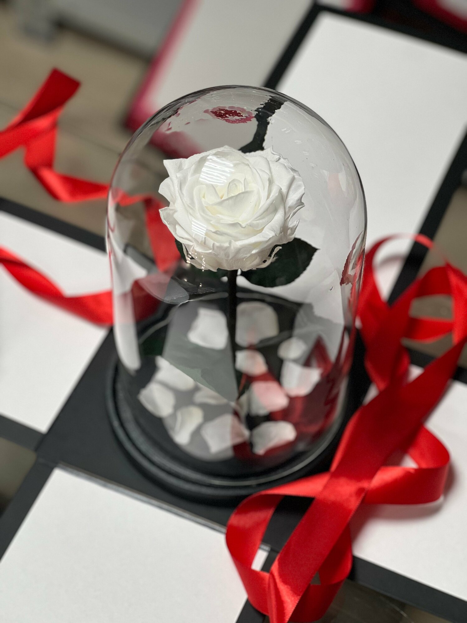 Купить Белая роза в колбе «Премиум» в подарочной коробке с вау эффектом/26 см /Живет 5 лет! с доставкой по всей России.