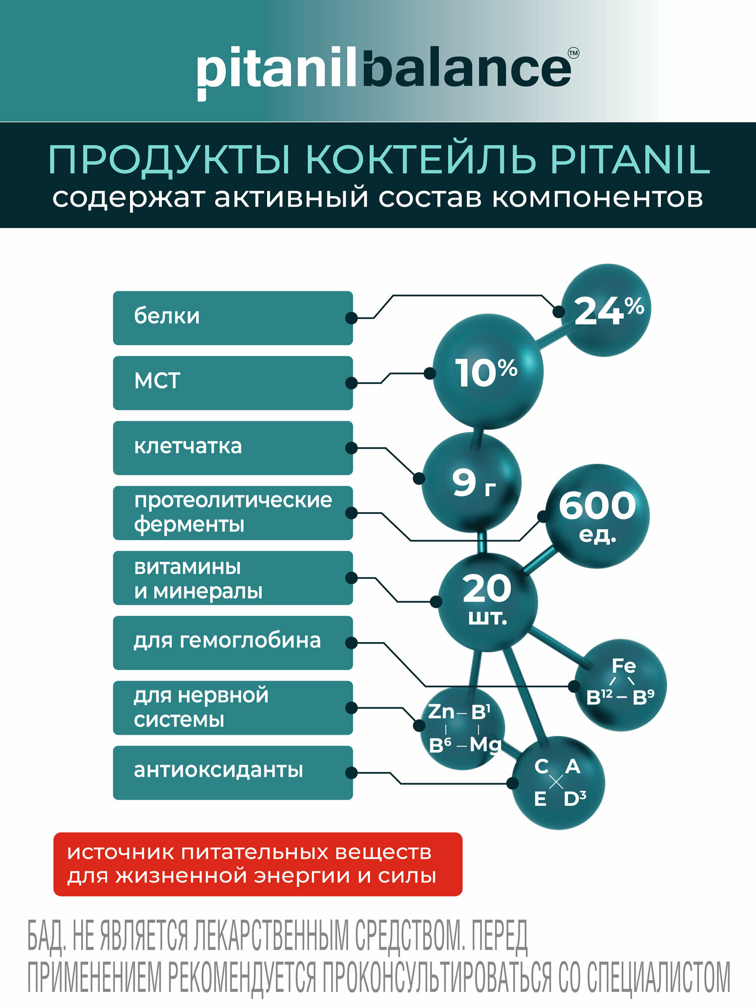 Позволяет контролировать дозировку для максимального эффекта.Усиленная формула активных компонентов Коктейль Pitanil: разработан для нутритивной поддержки жизненной энергии и силы