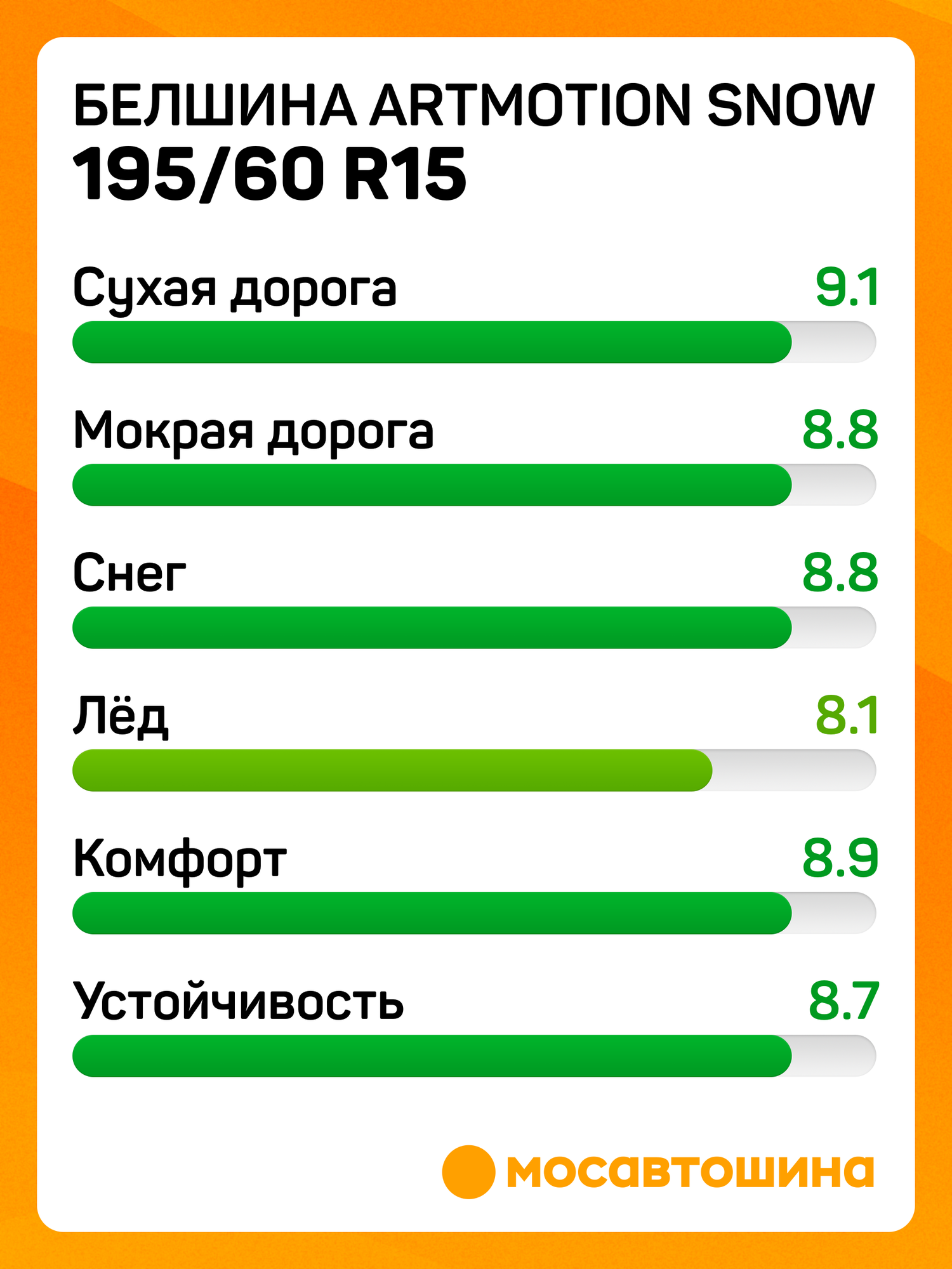 Модель шин Белшина Бел-307 Artmotion Snow представляет отличный выбор для автомобилей среднего сегмента, а также для других автомобилей с соответствующими размерами. Эти зимние шины являются практичными и надежными, не имеют шипов, что делает их отличным вариантом для передвижения в современных городах. Одновременно они демонстрируют высокие характеристики как на трассе. Вот ключевые преимущества этой модели: Улучшенная конструкция двунаправленных Z-образных ламелей. Они обильно представлены на каждом блоке протектора и в процессе движения раскрываются, создавая дополнительные кромочные грани в контактной зоне. Это существенно улучшает сцепление, тяговые характеристики и способствует более эффективному торможению. Использование инновационного компаунда с добавлением специальных морозостойких добавок. Даже при сильных морозах резина остается эластичной, а также устойчивой к повреждающим воздействиям. Эффективная дренажная система, объединяющая кольцевые и поперечные канавки. Она обеспечивает быструю эвакуацию воды, а также слякоти и снега из контактной зоны, обеспечивая лучшее сцепление с дорогой. Производство шин Бел-307 Artmotion Snow осуществляется на известном заводе в городе Бобруйске. Они прошли необходимую сертификацию и оптимально подходят для использования на дорогах бывшего СССР. Эти шины воплощают в себе комбинацию качества, надежности и приспособленности к сложным зимним условиям.