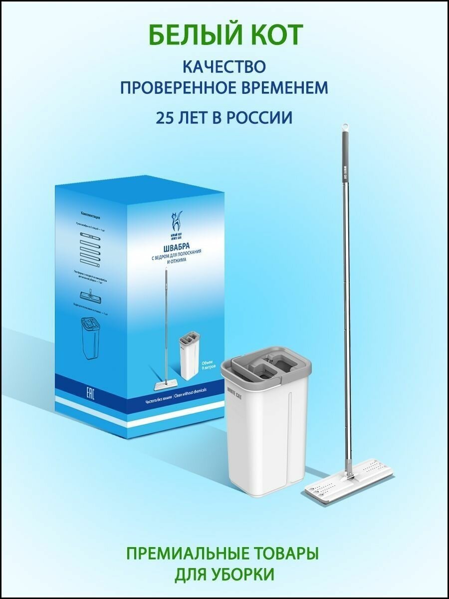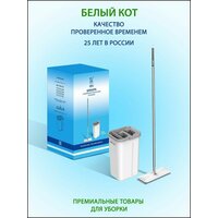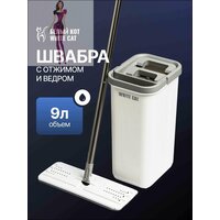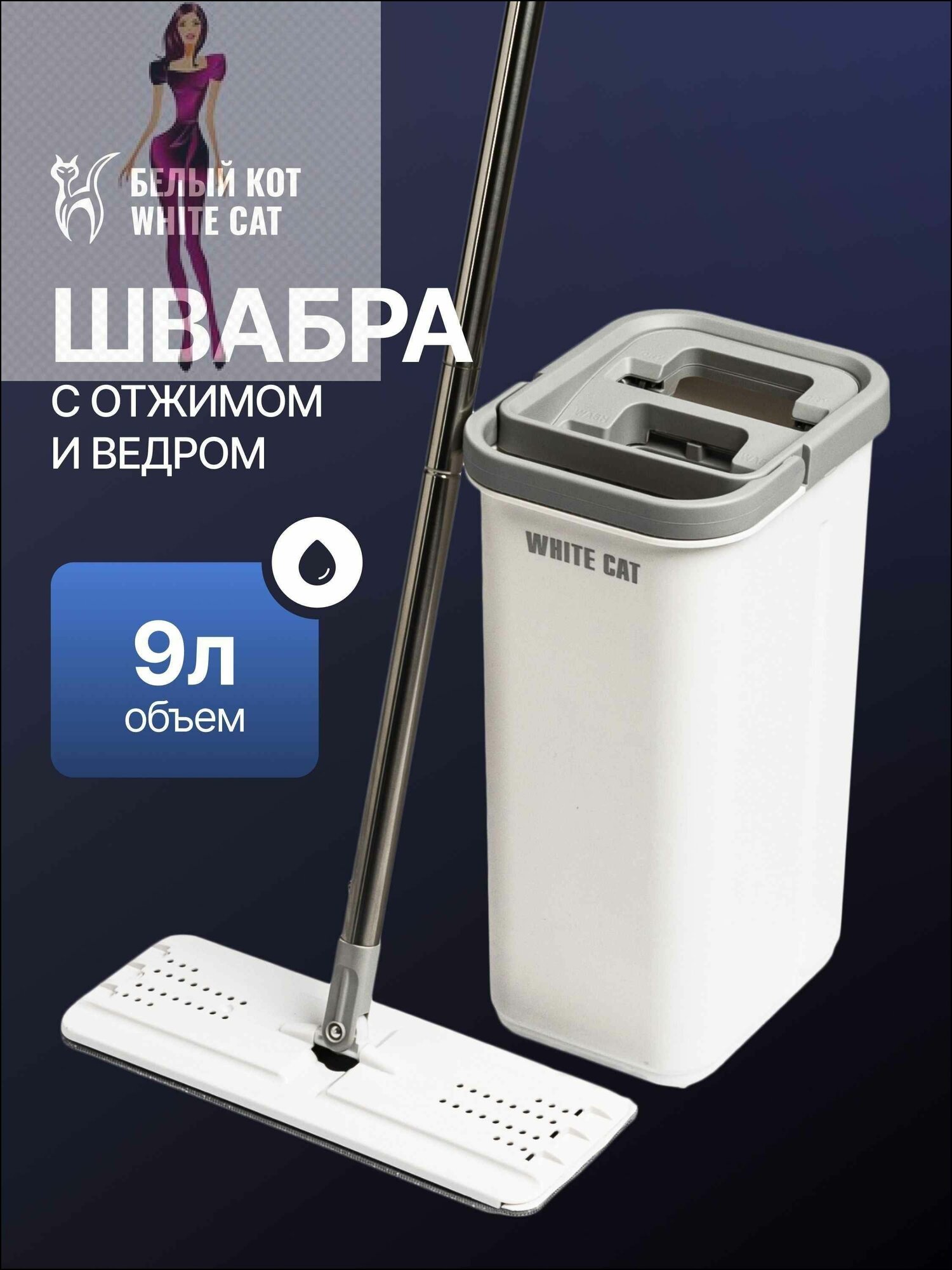 Белый КОТ — Швабра для мытья полов с ведром для отжима и полоскания 9 л, насадка из микрофибры для сухой и влажной уборки: сравнение цен, характеристики, фото, актуальное наличие и цены.